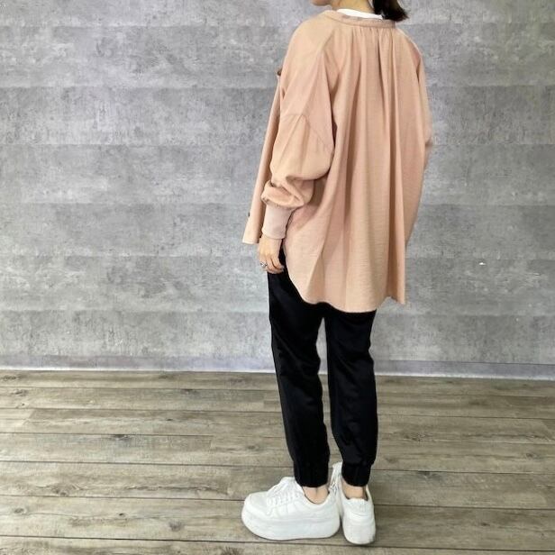 裾絞りのジョガーシルエットで、足下はもたつかず