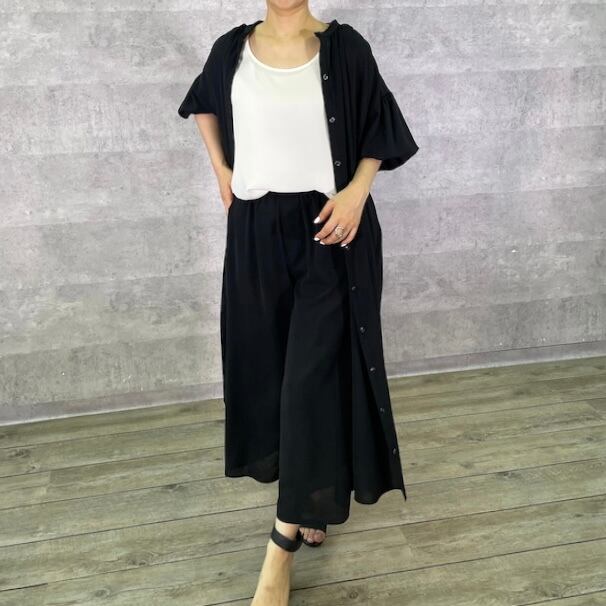 同素材のギャザーバンドカラーシャツや、ギャザーバンドカラーワンピースなどを合わせると、今までにない新鮮なスタイリングをお楽しみ頂けます。