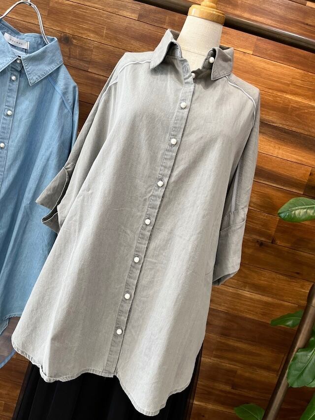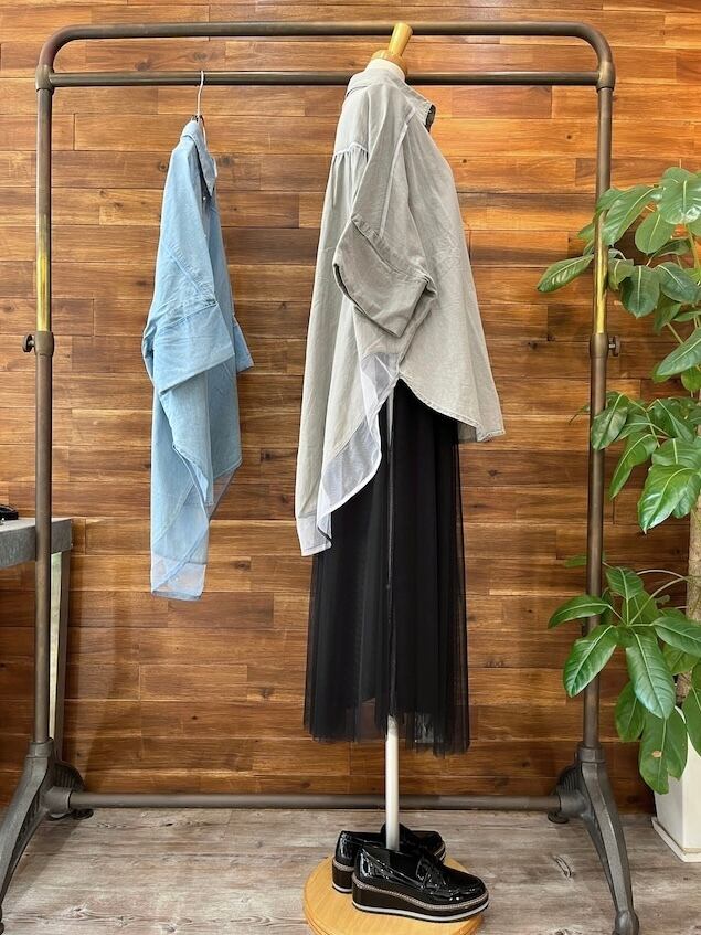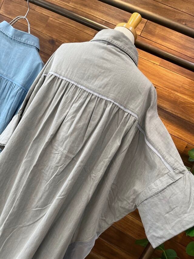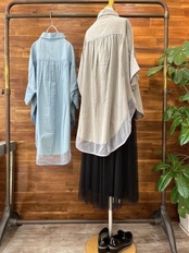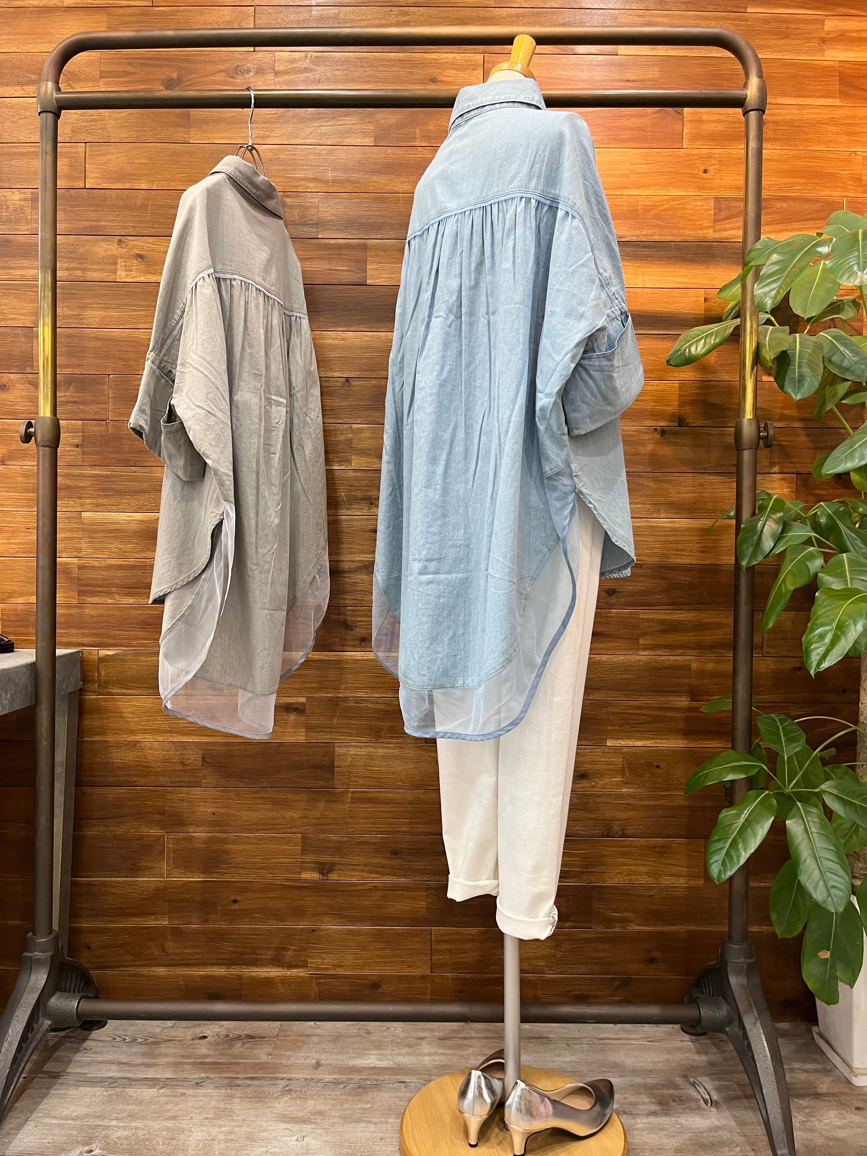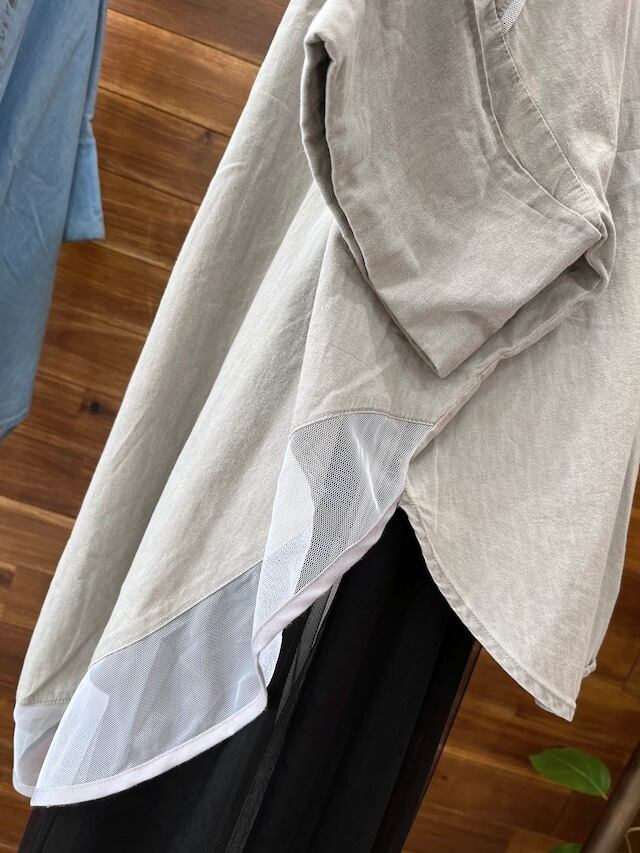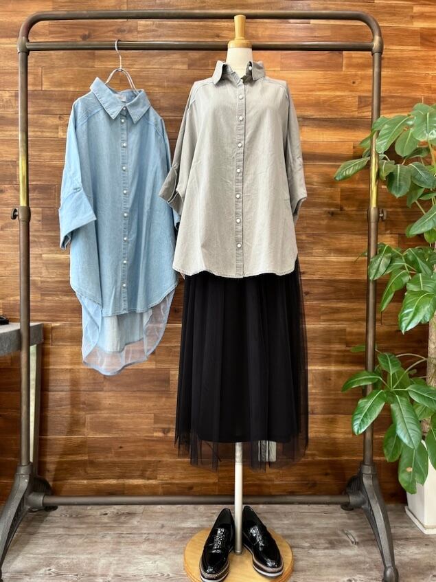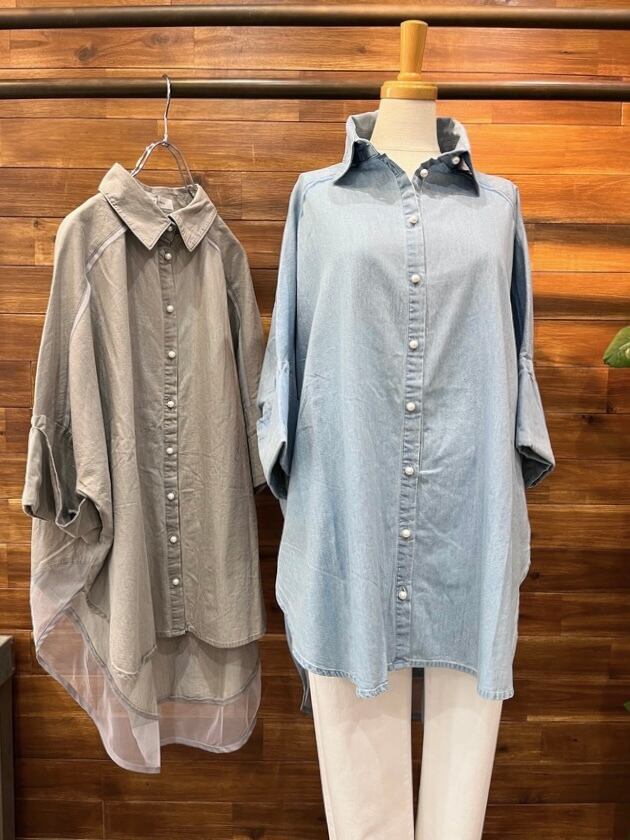 裾にチュールとパールがあしらわれた、ゆったりとしたBIGシャツです。