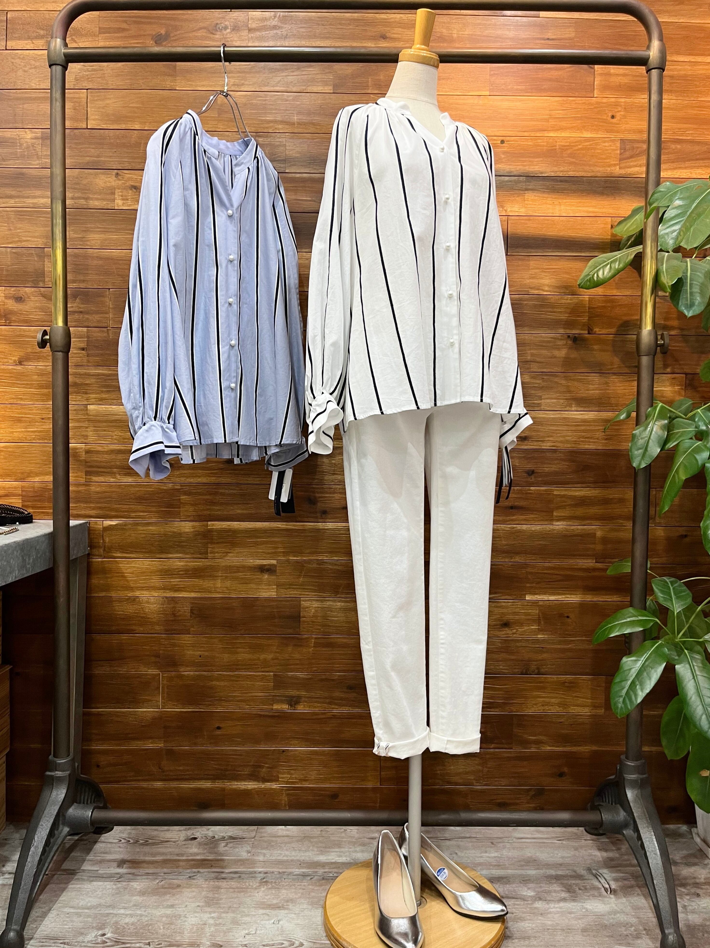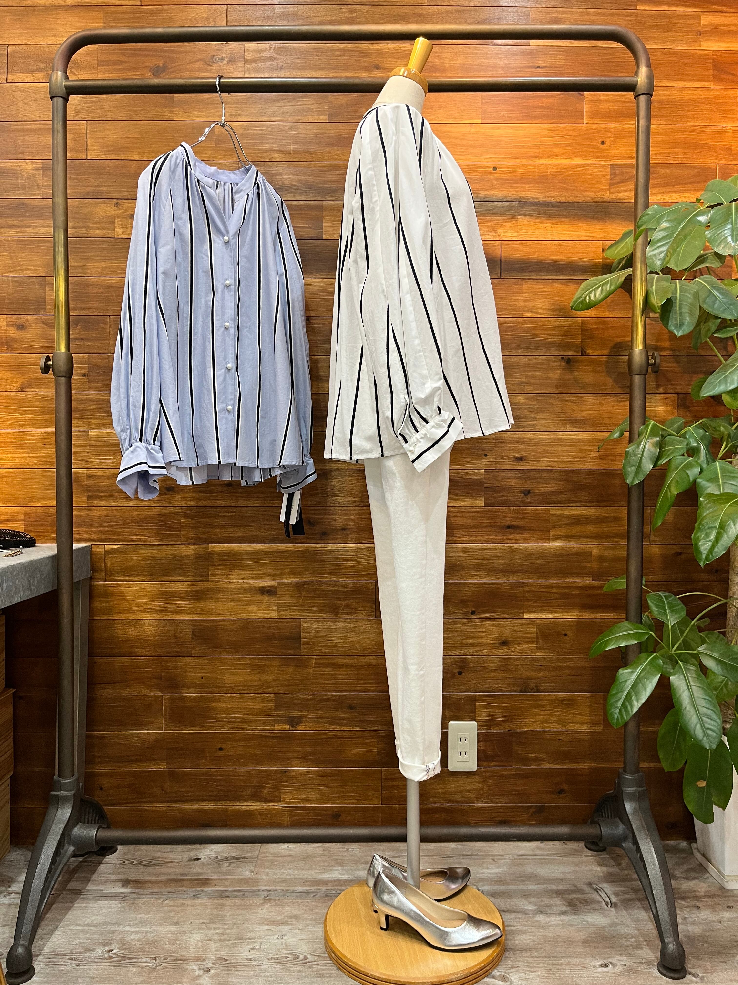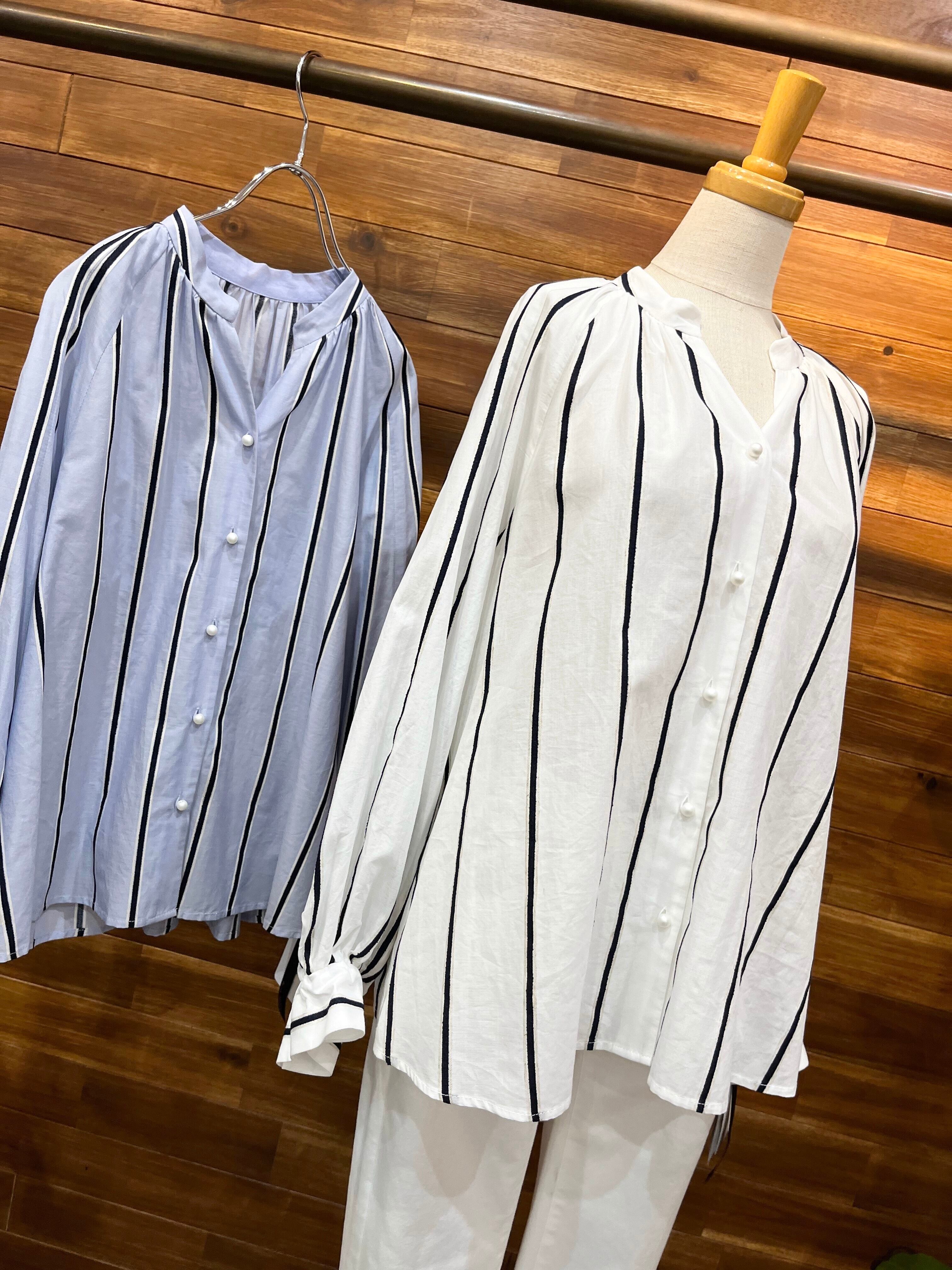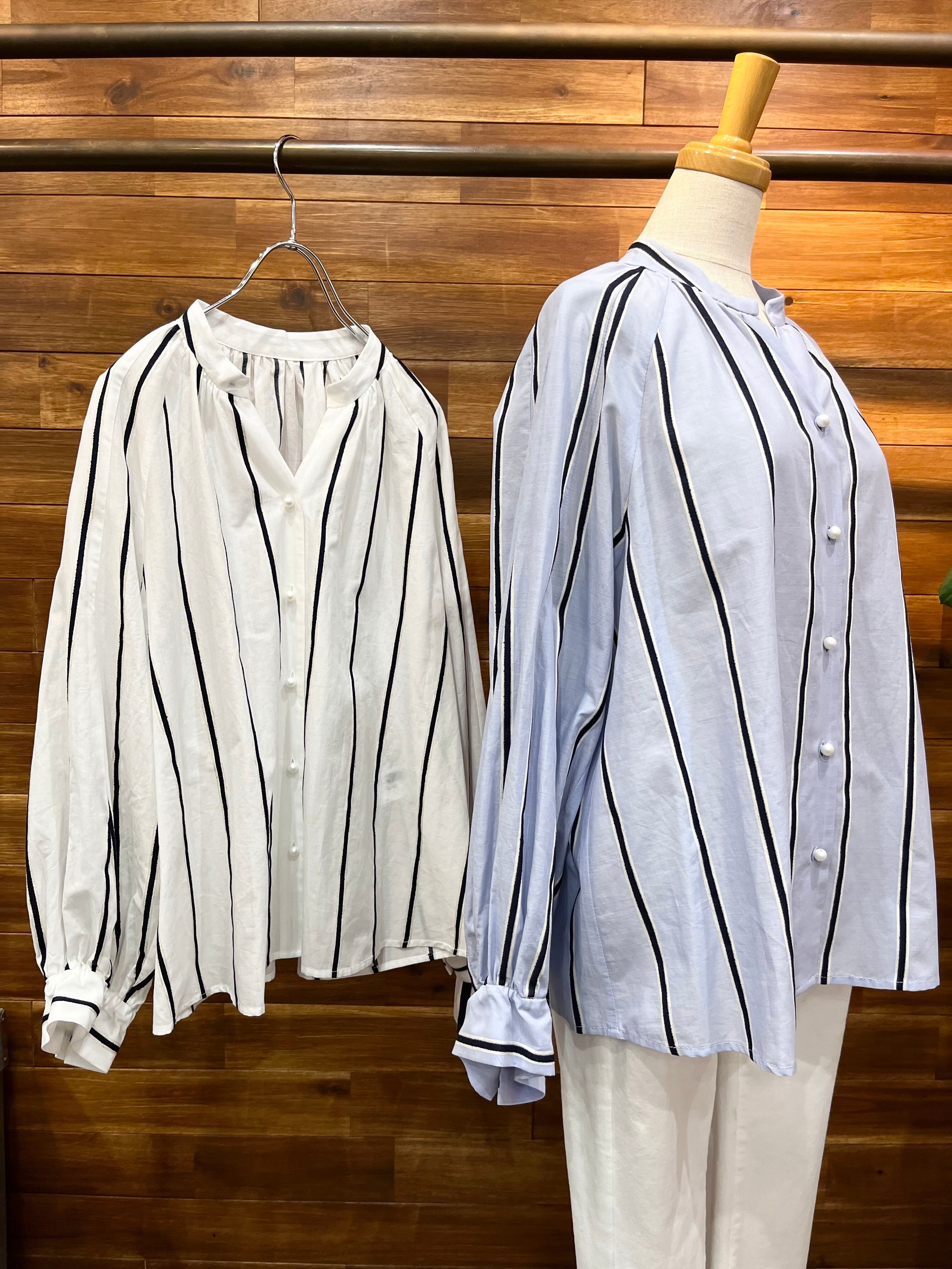 上品なストライプ柄と、きらめくパールボタンがポイントのブラウス♡