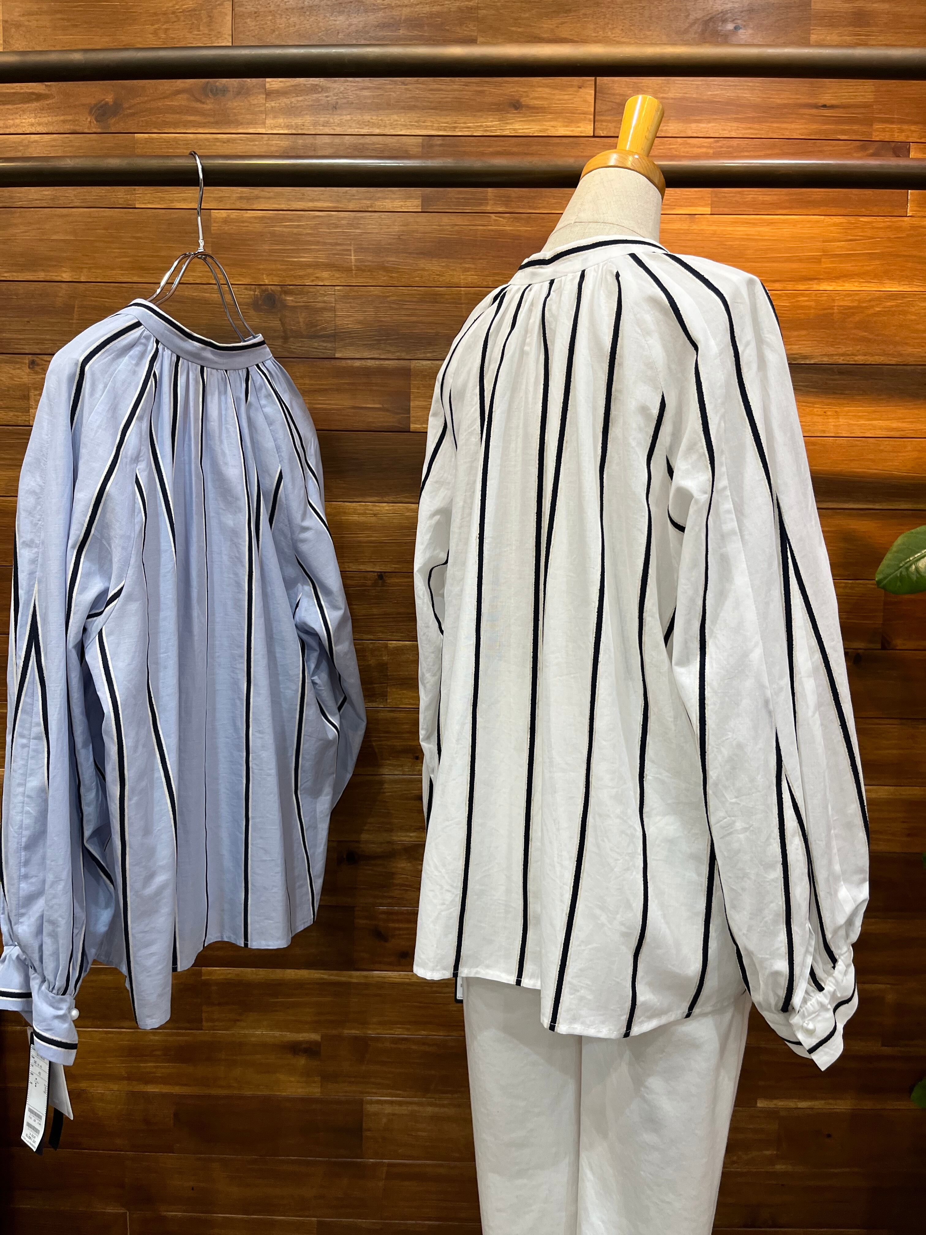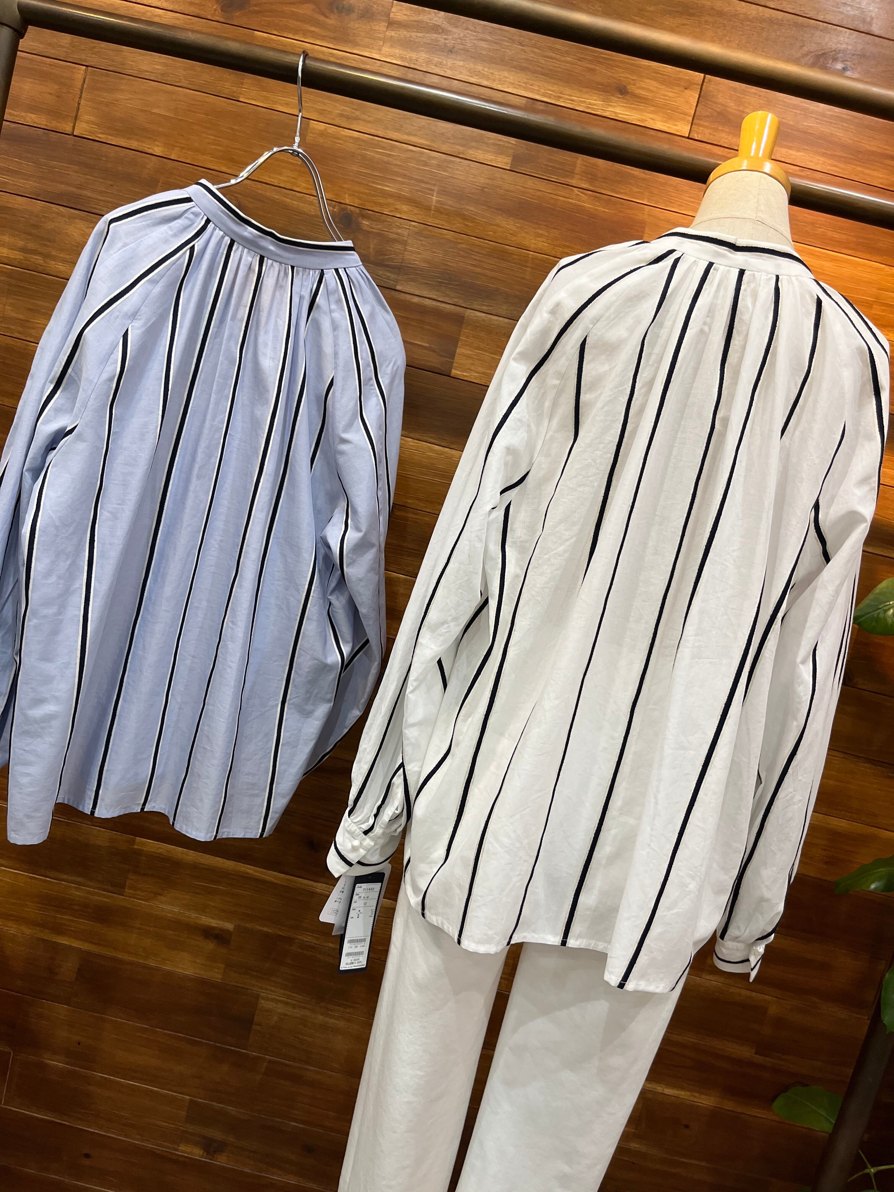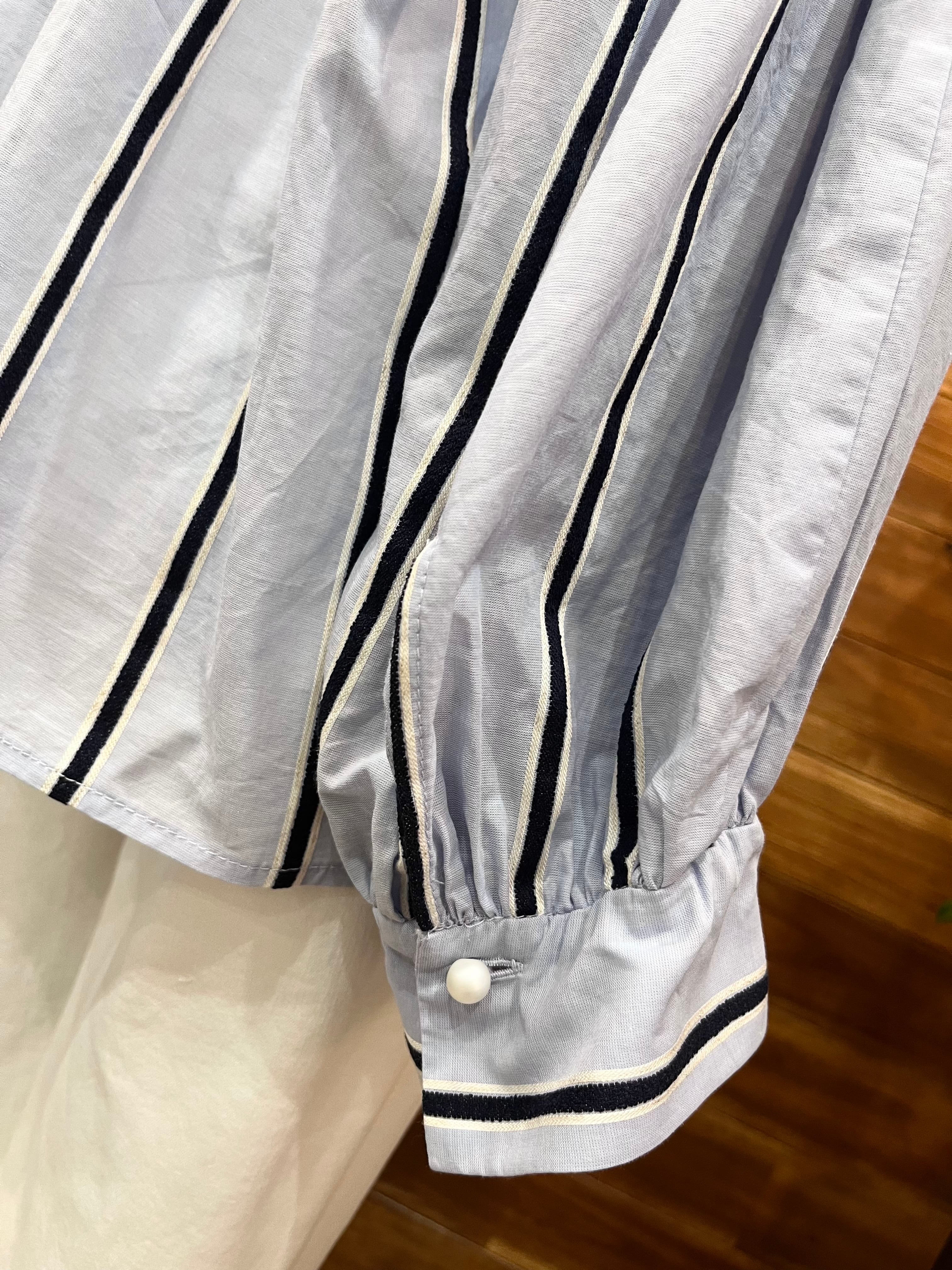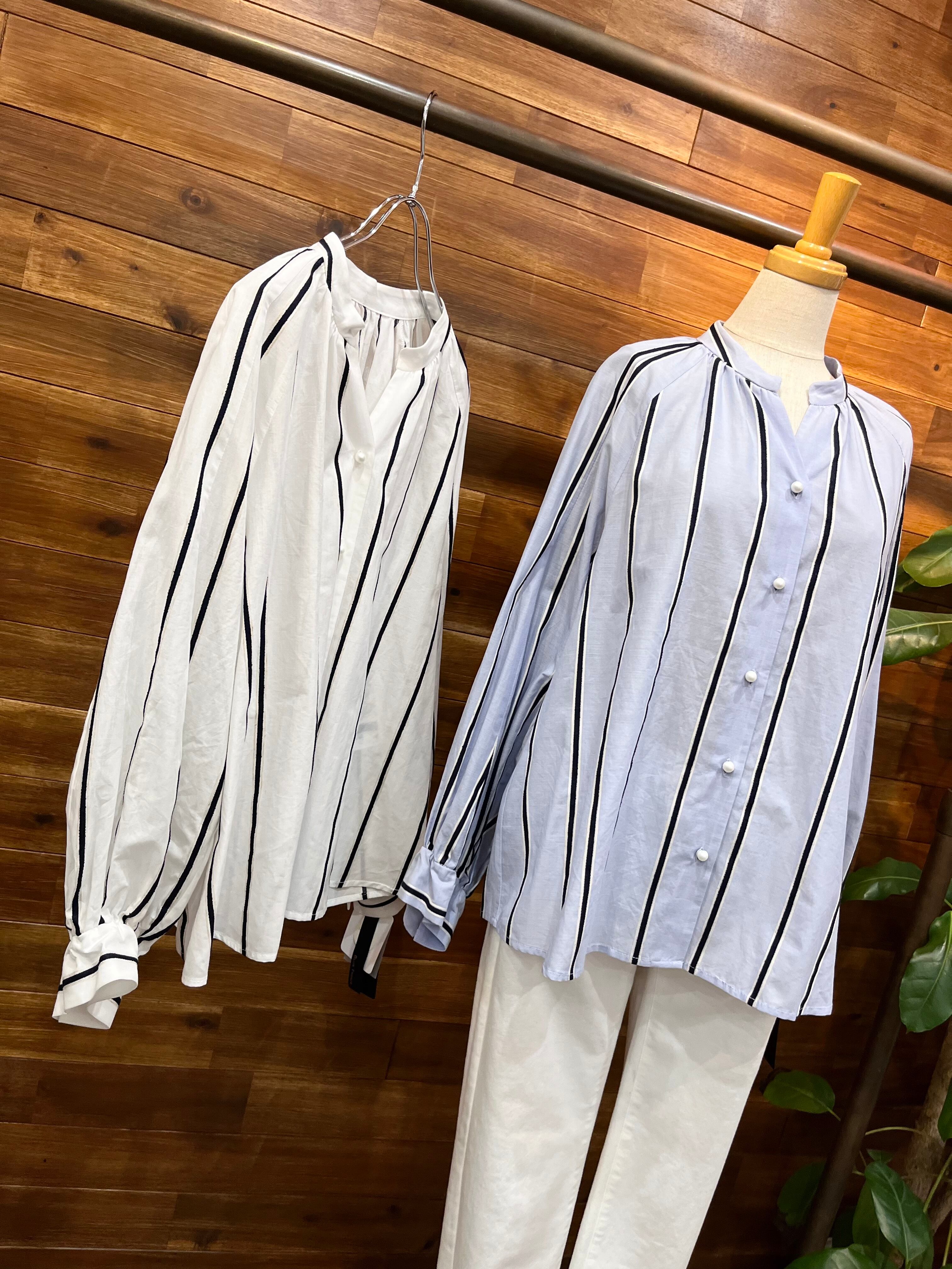上品なストライプ柄と、きらめくパールボタンがポイントのブラウス♡