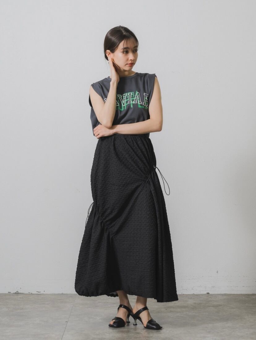 アシンメトリーな切り替えデザインで、ドロストを調節することによってシルエットを変化させることができます。