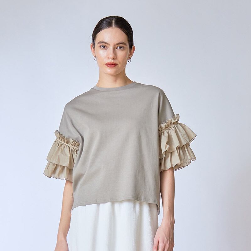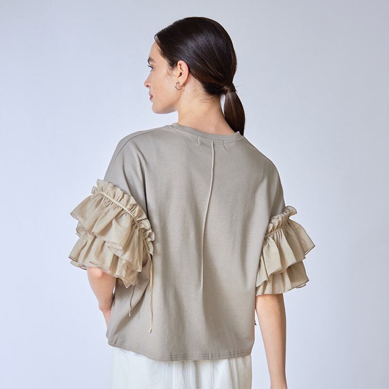 大きめに施されたボリュームのあるフリルの袖口がとっても特徴的なスリーブTシャツです。