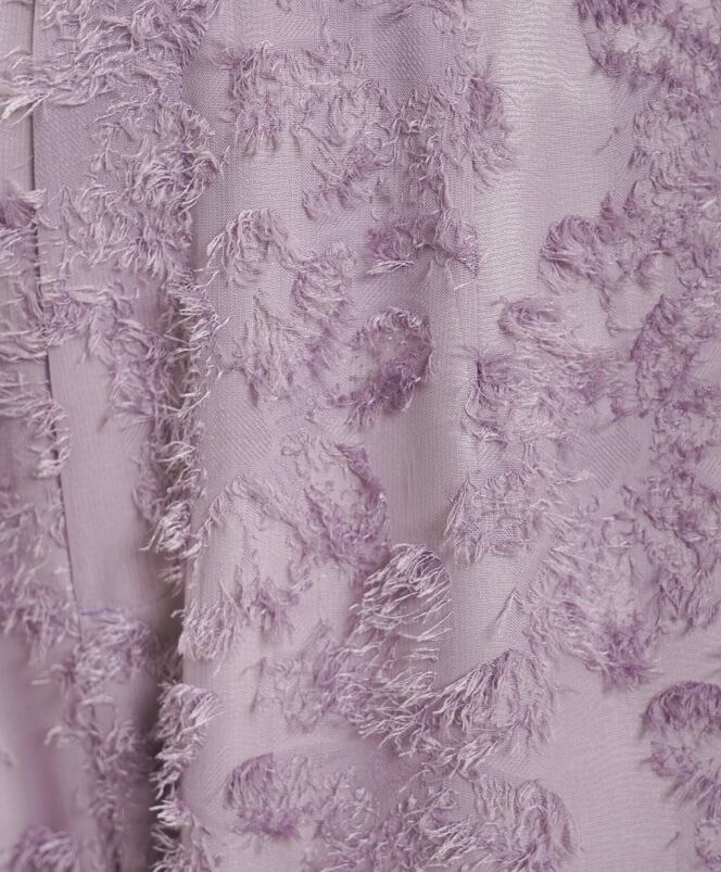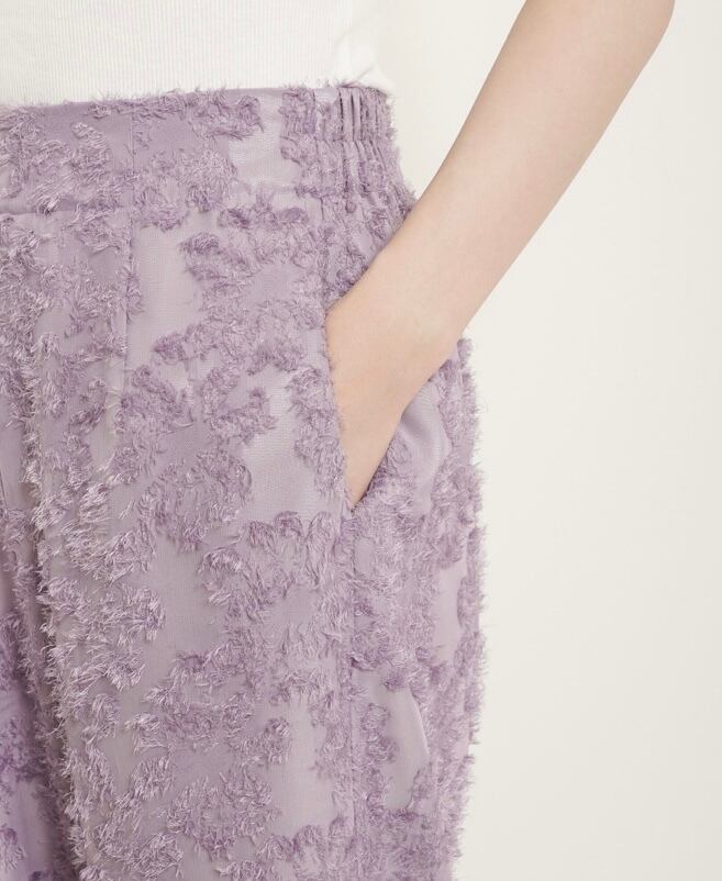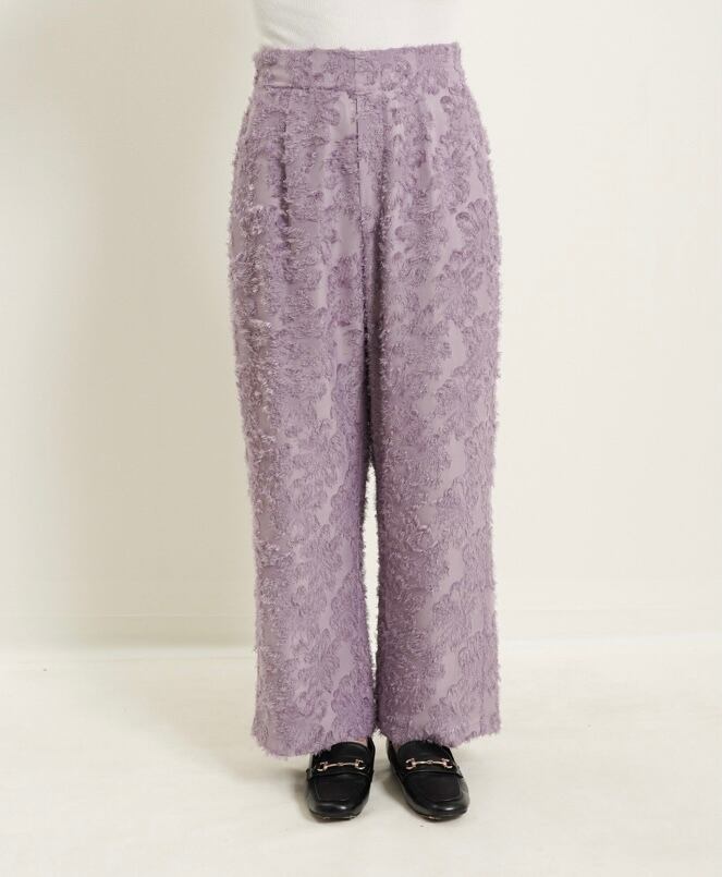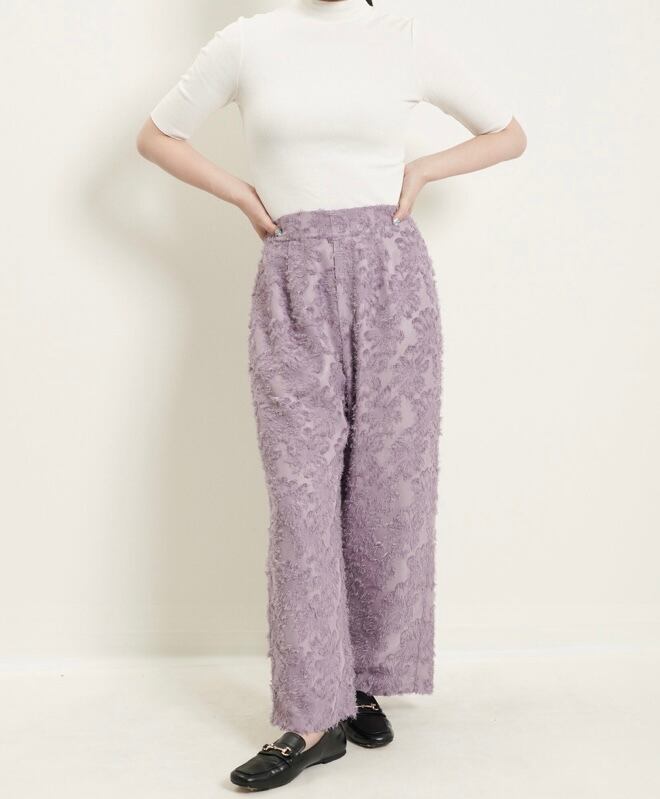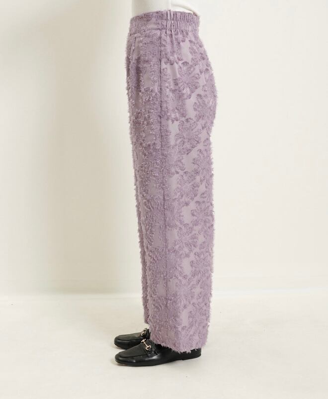 華やかなカラーと質感のカットJQを使用したセミワイドパンツ。