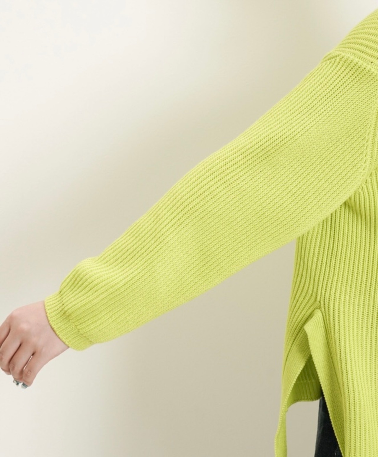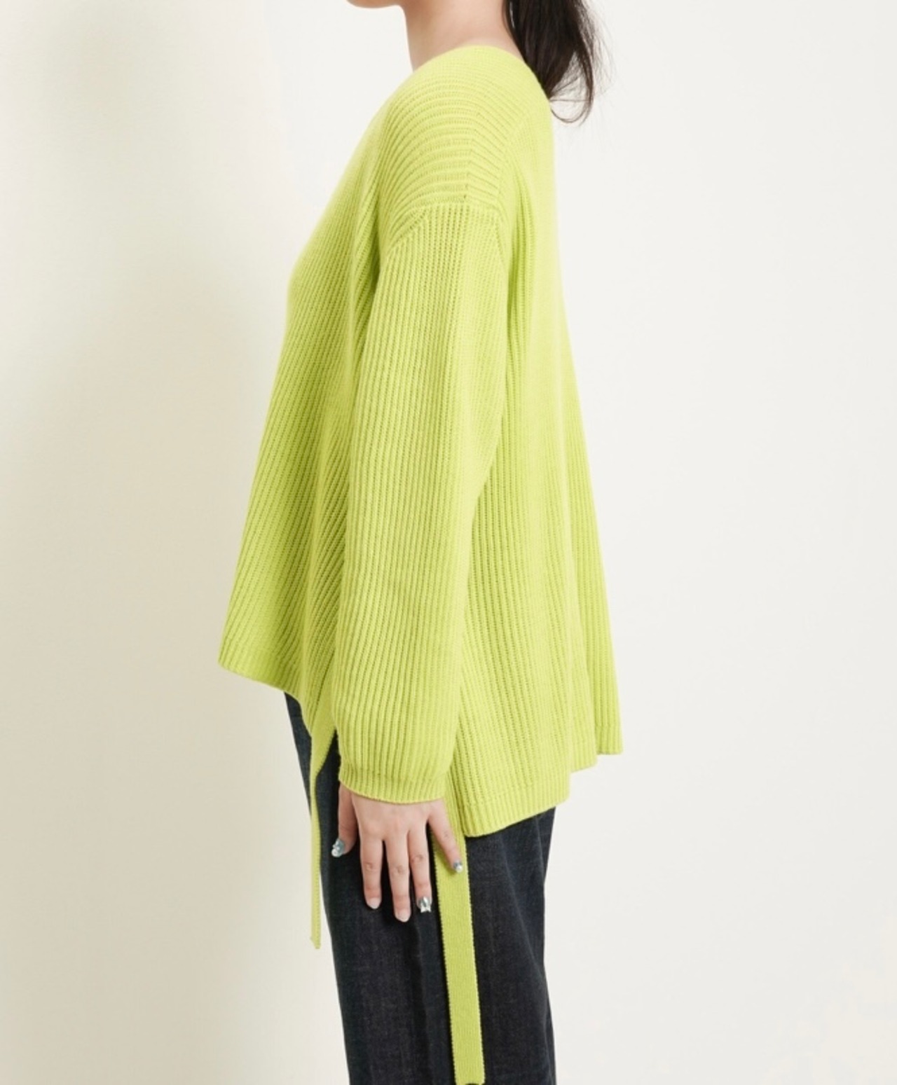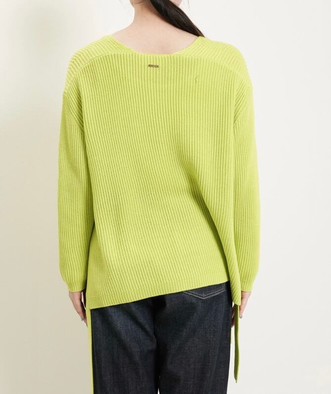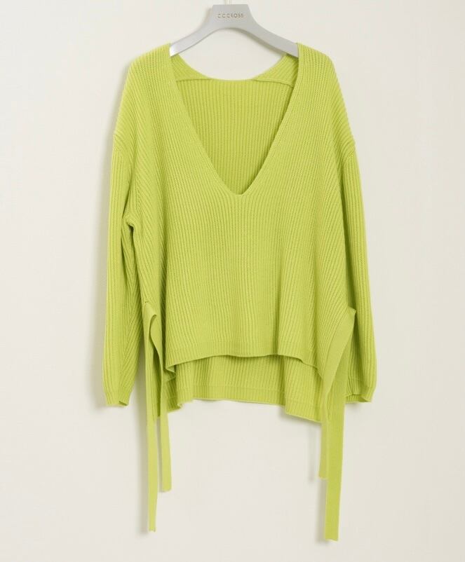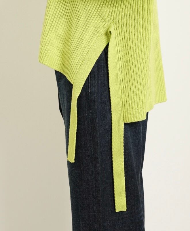サイドスリットにニットの同素材のリボンを編み合わせたのがポイントとなっております