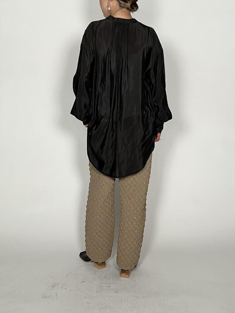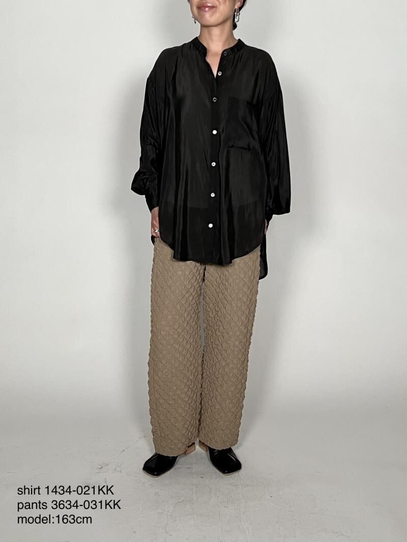 凹凸感のある素材のパンツですので、シンプルなトップスと合わせてもスタイリングが決まるアイテムになっています。