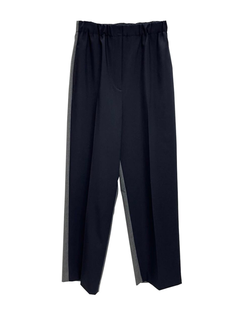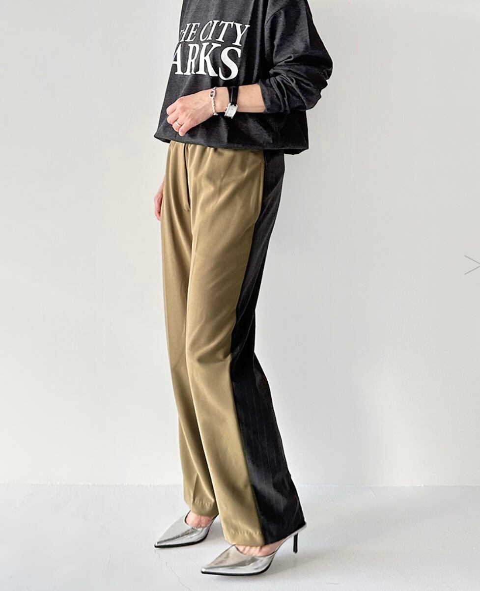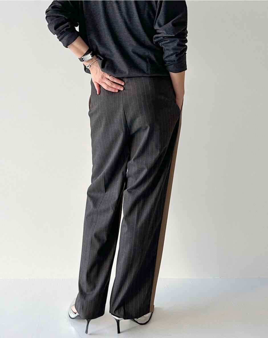 マニッシュな印象のスーツ地で無地とトレンドのピンストライプを大胆な配色に組み合わせたパンツになります。