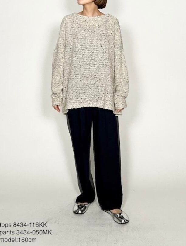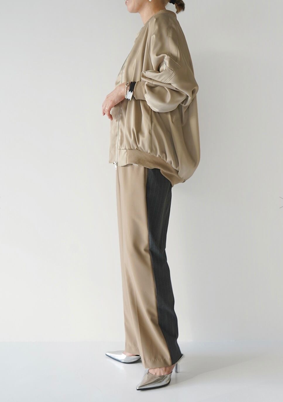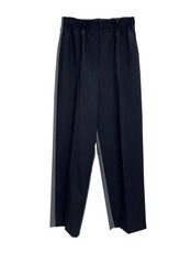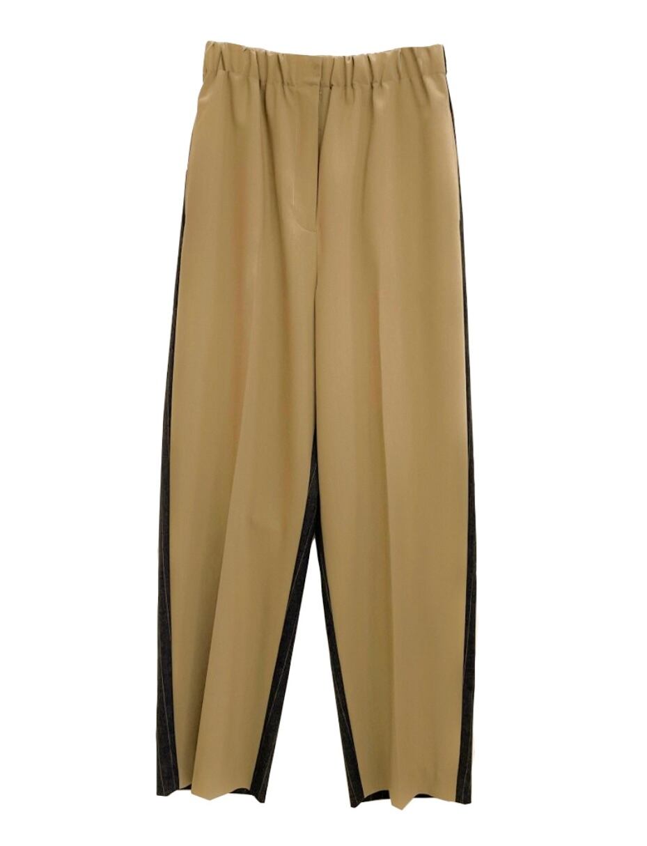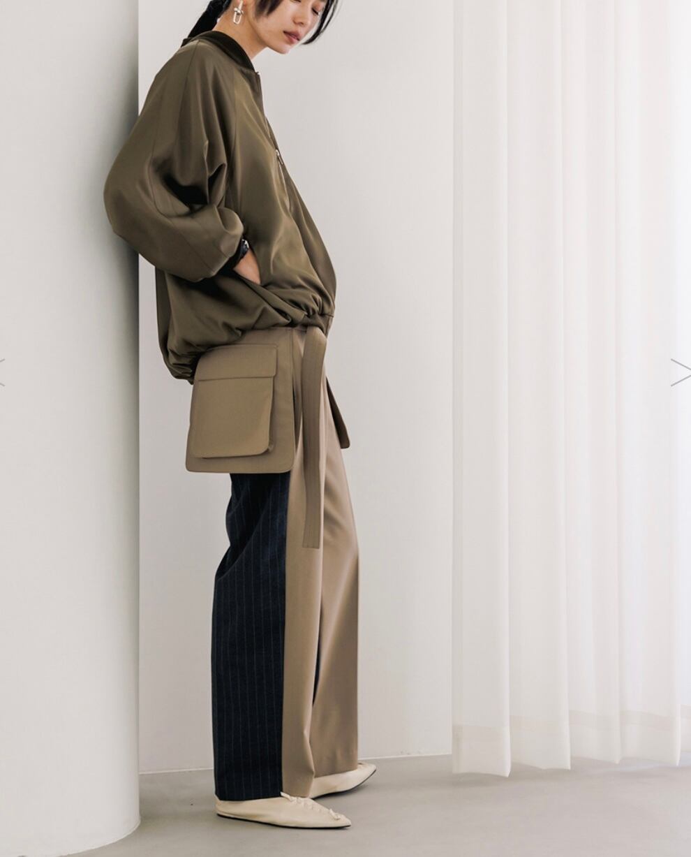 マニッシュな印象のスーツ地で無地とトレンドのピンストライプを大胆な配色に組み合わせたパンツになります。