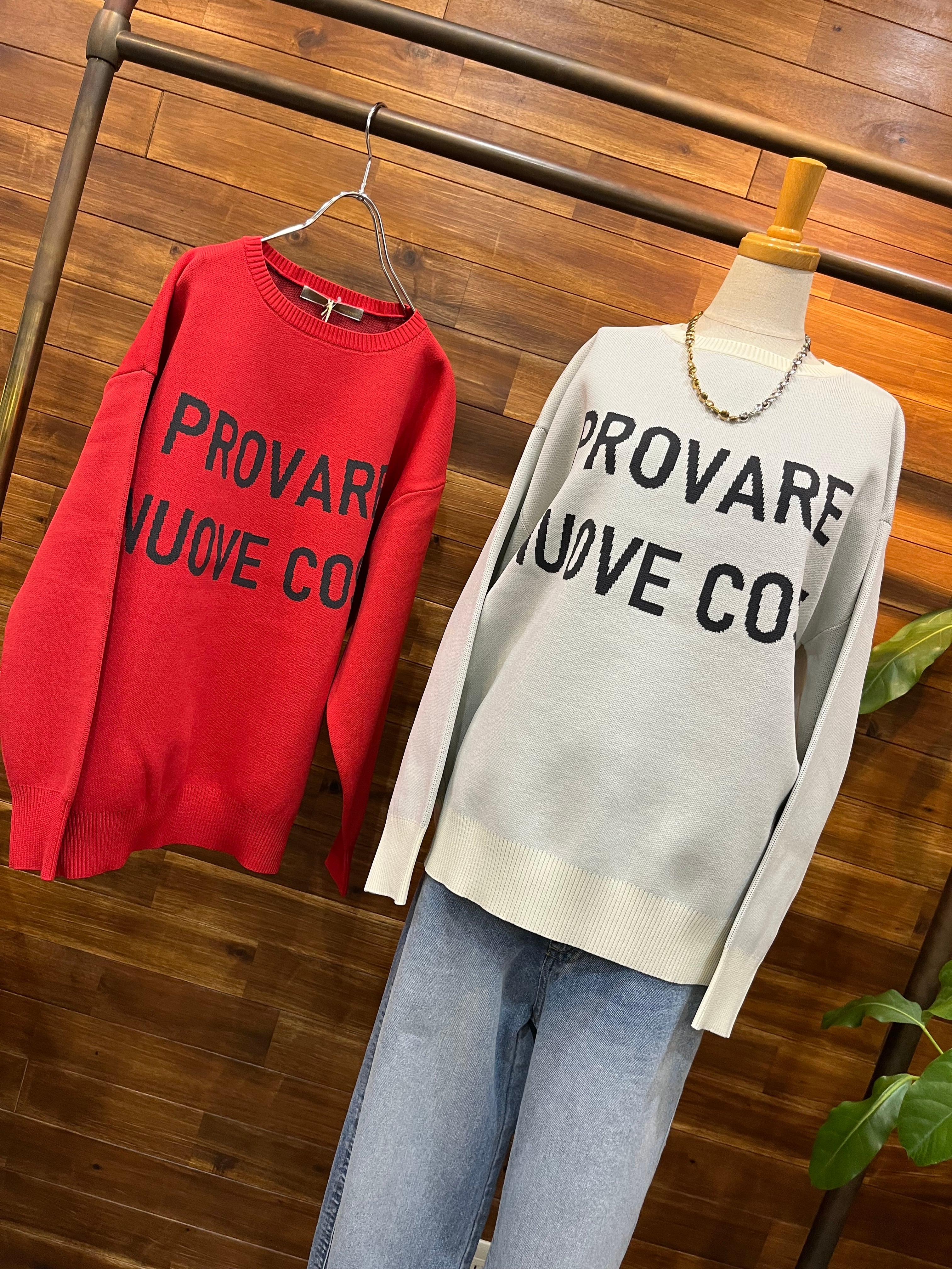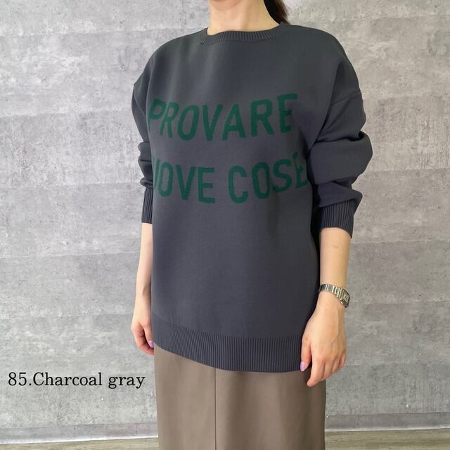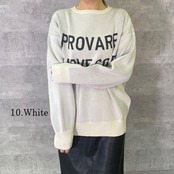 パッと目を惹く大胆なロゴが、前後にデザインされたニットです。