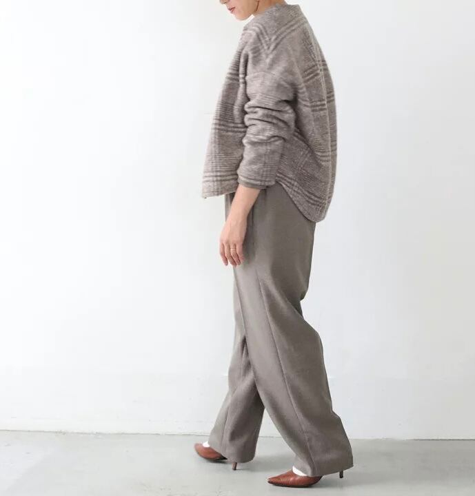 後身頃を切り替え、丸くコクーンシルエットになるようにパターン展開したデザインで、角度をつけた肩ラインは、少し後ろに抜けるような着用感で、後身頃やアームまわりのたっぷりとしたボリューム感をより引き立てるようなシルエットになっています。
