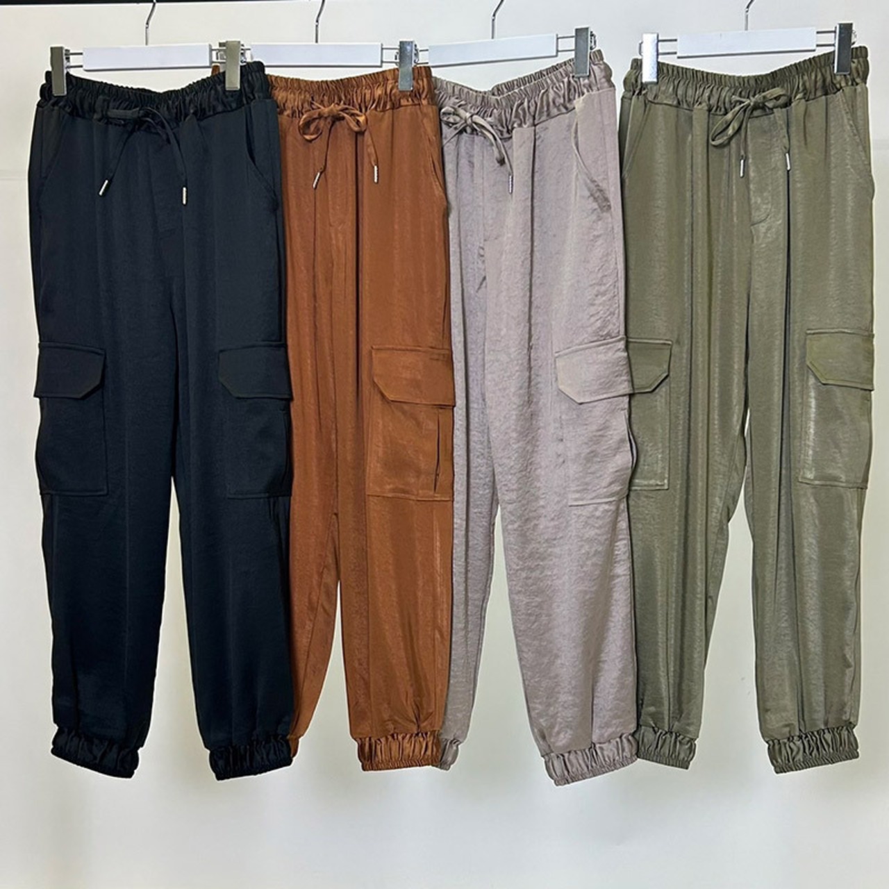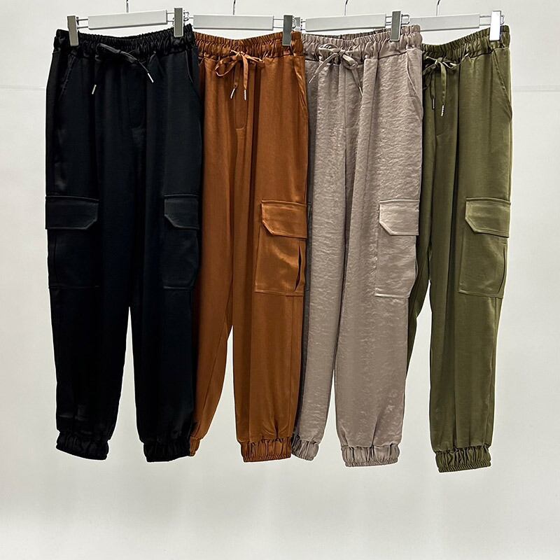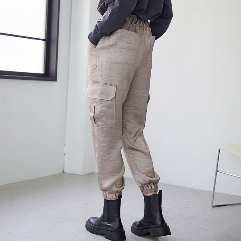 カジュアルなカーゴパンツを、サテンのとろんとした質感を活かし女性らしく上品で落ち着いた印象に。