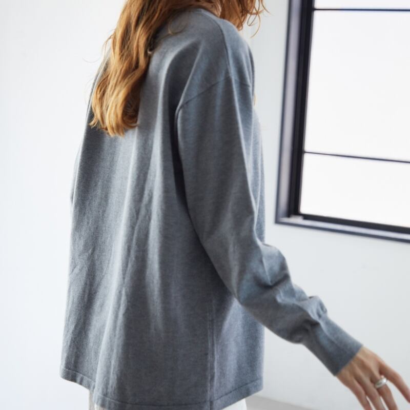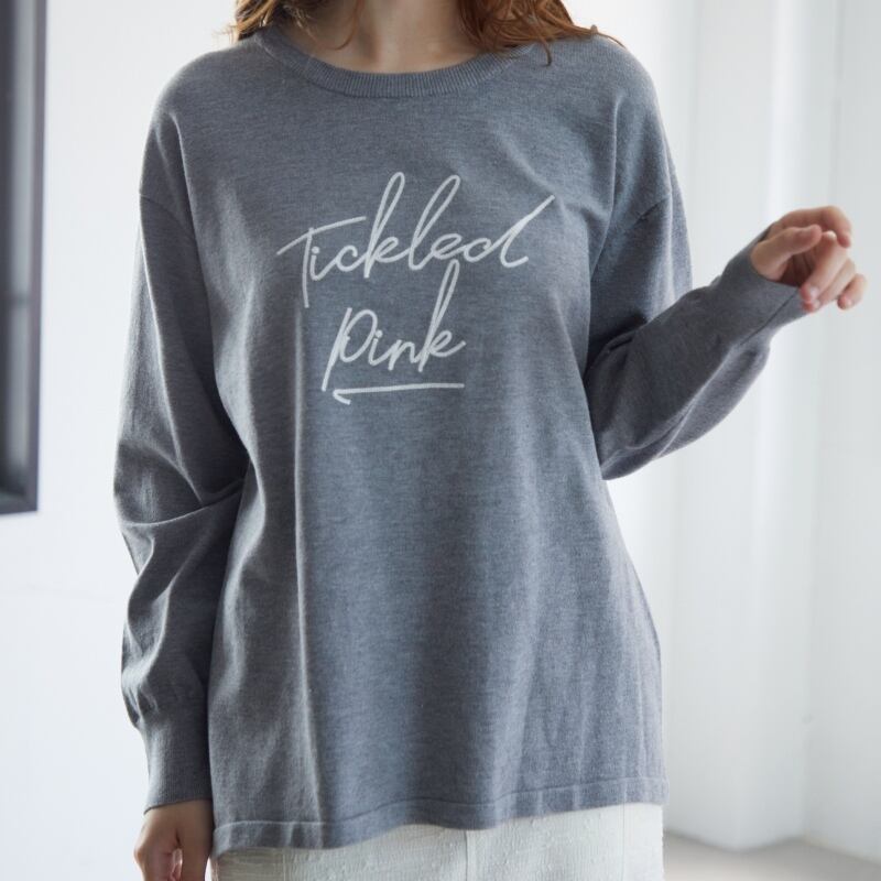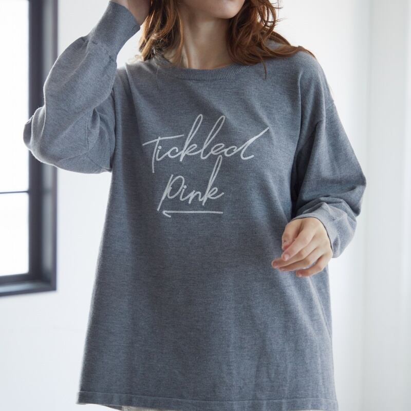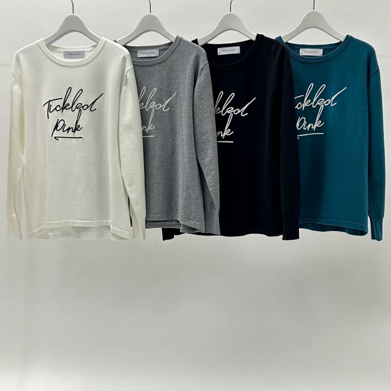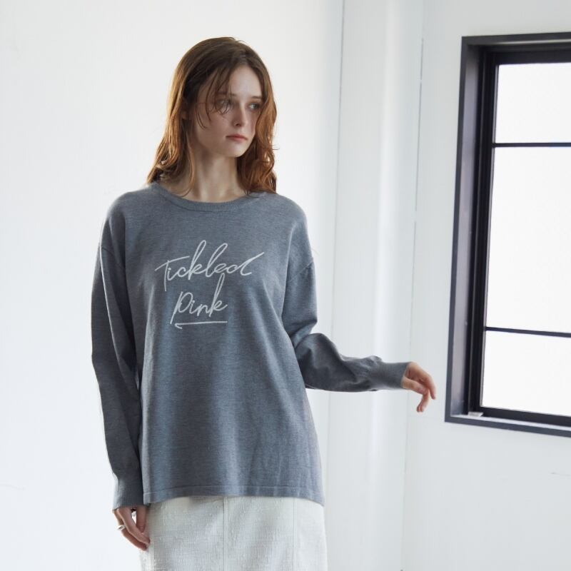 チェーン刺繍のロゴがカジュアルになりすぎない大人っぽさと、抜け感と落ち着きのある雰囲気に決まるニットです。