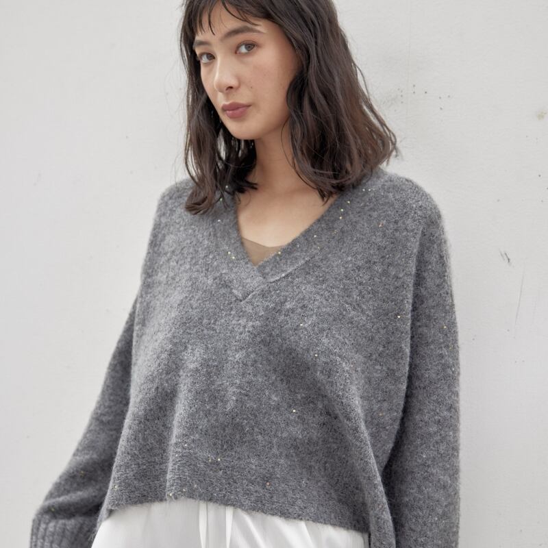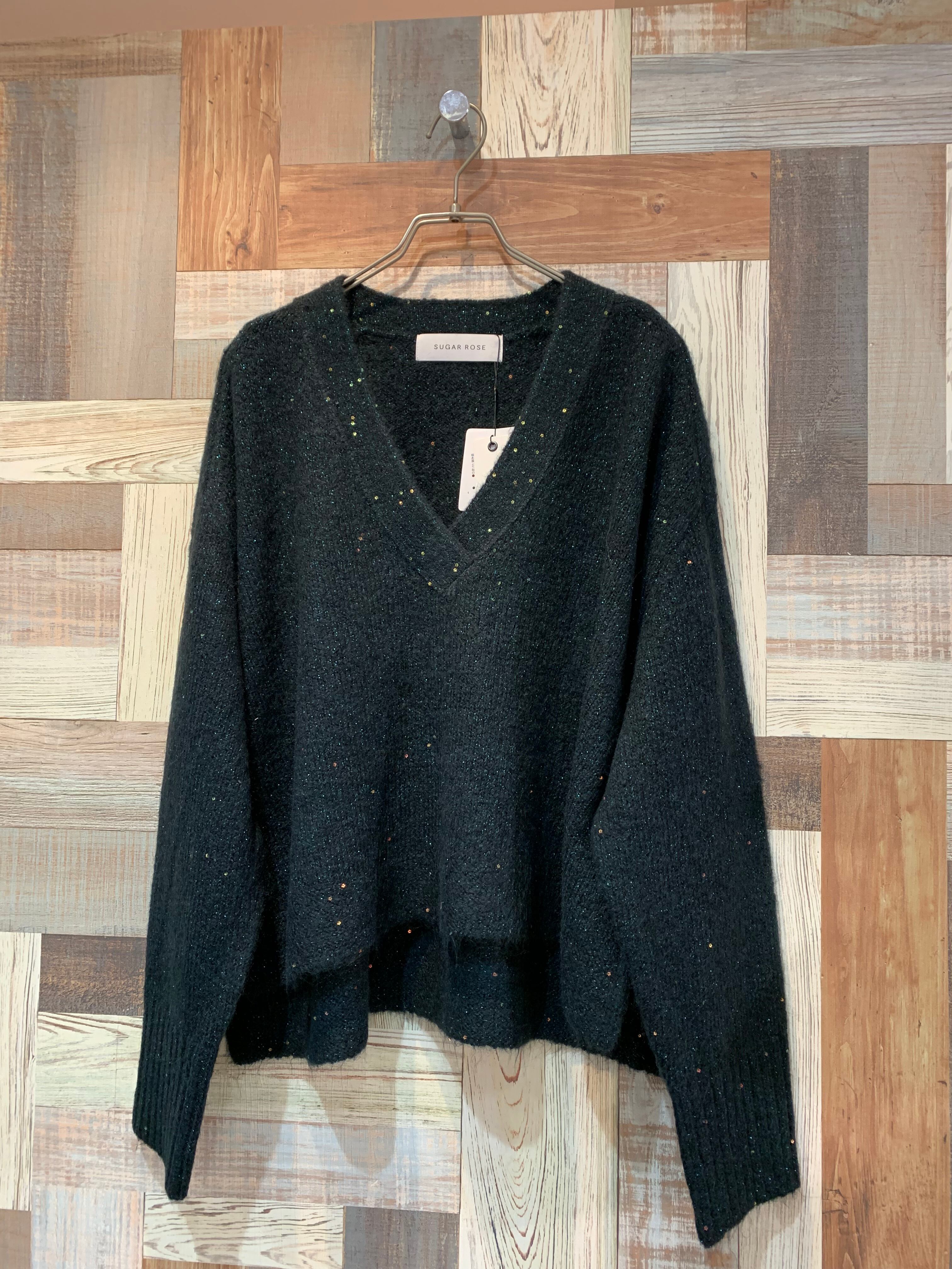 スパンコールがちりばめられたスパークル深Vネックニット。