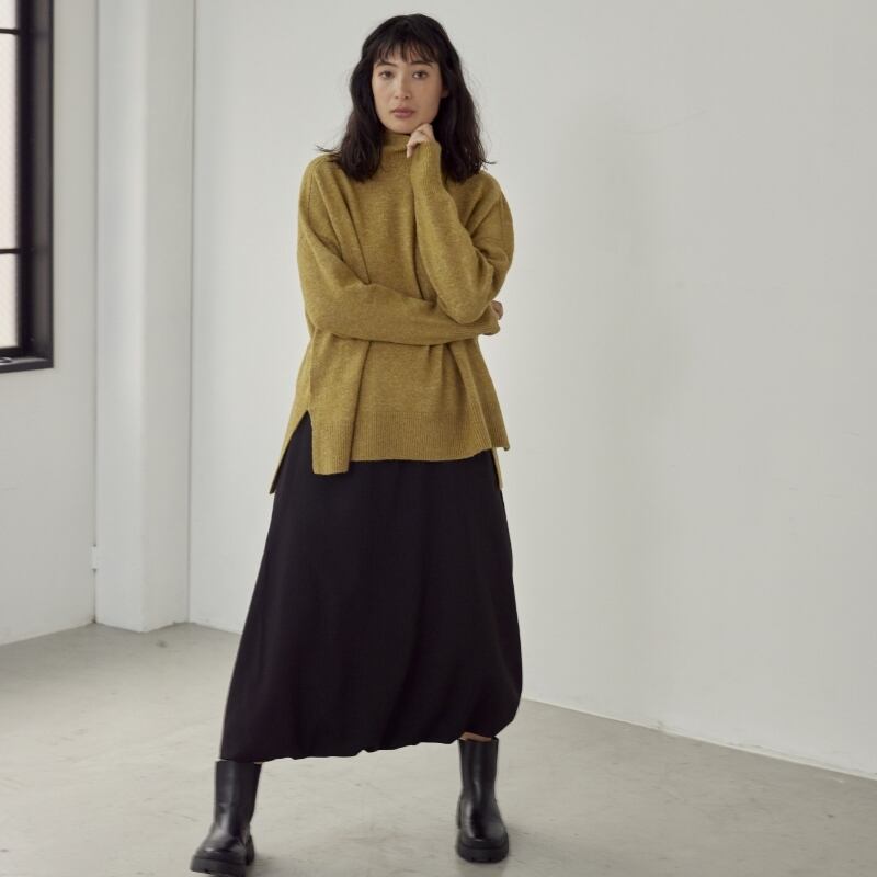 合わせるトップスを選ばないシンプルなデザインな為、 ドロストを絞って、カジュアル感を出した丸みのあるスタイルや、緩めて程よいフレアな裾の揺れを楽しむスタイルも◎。
