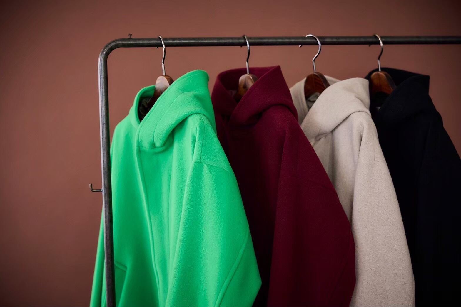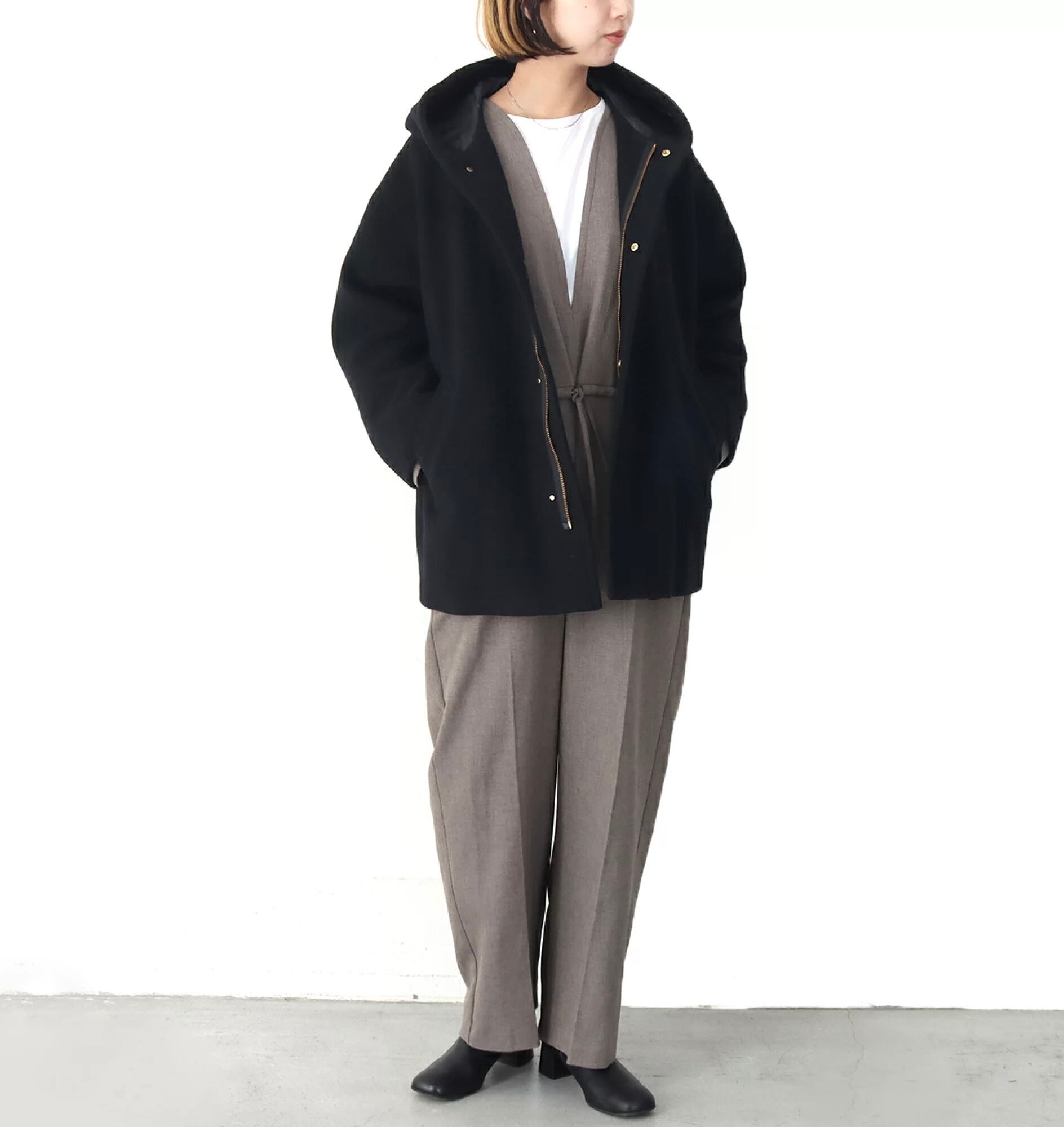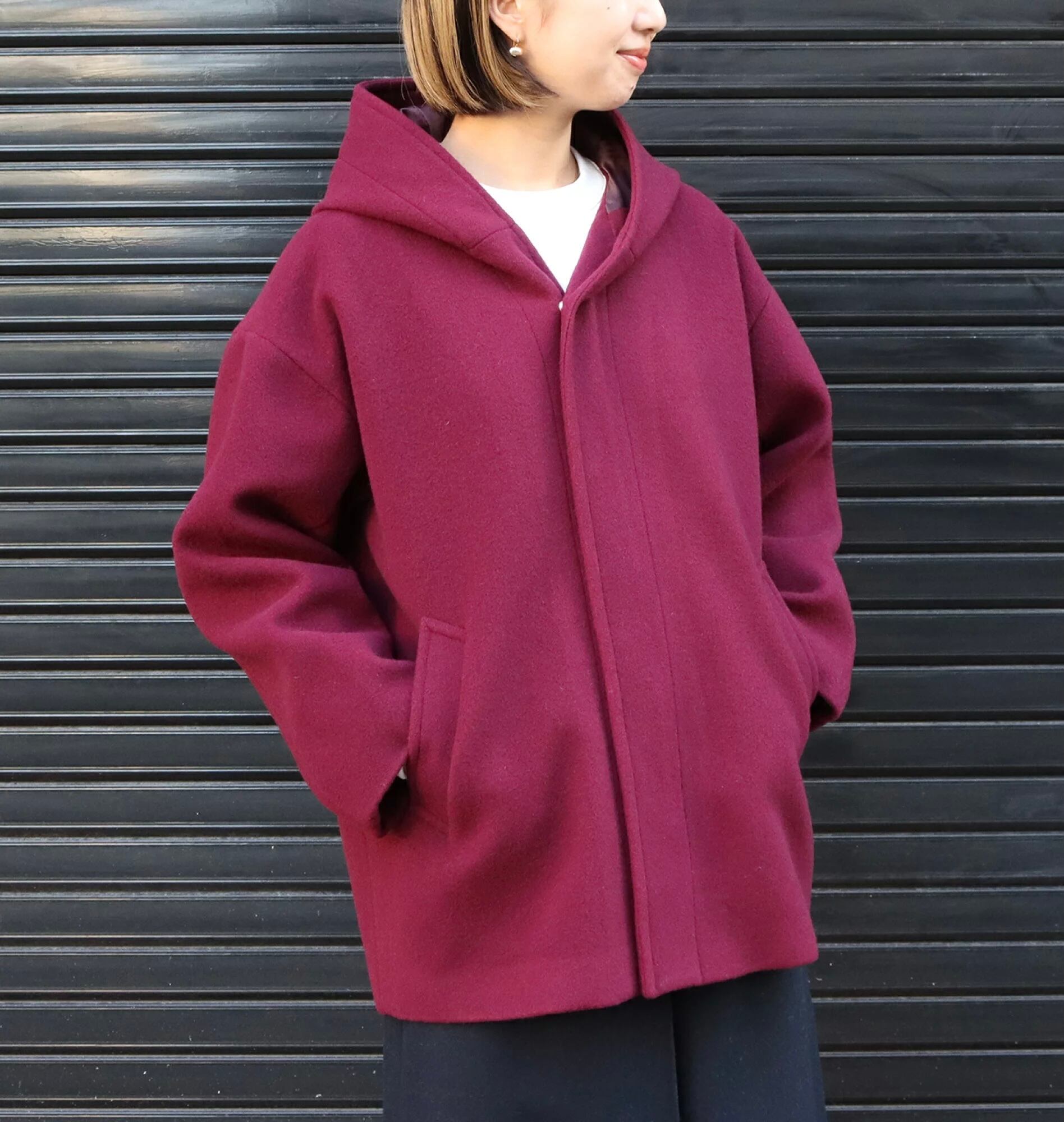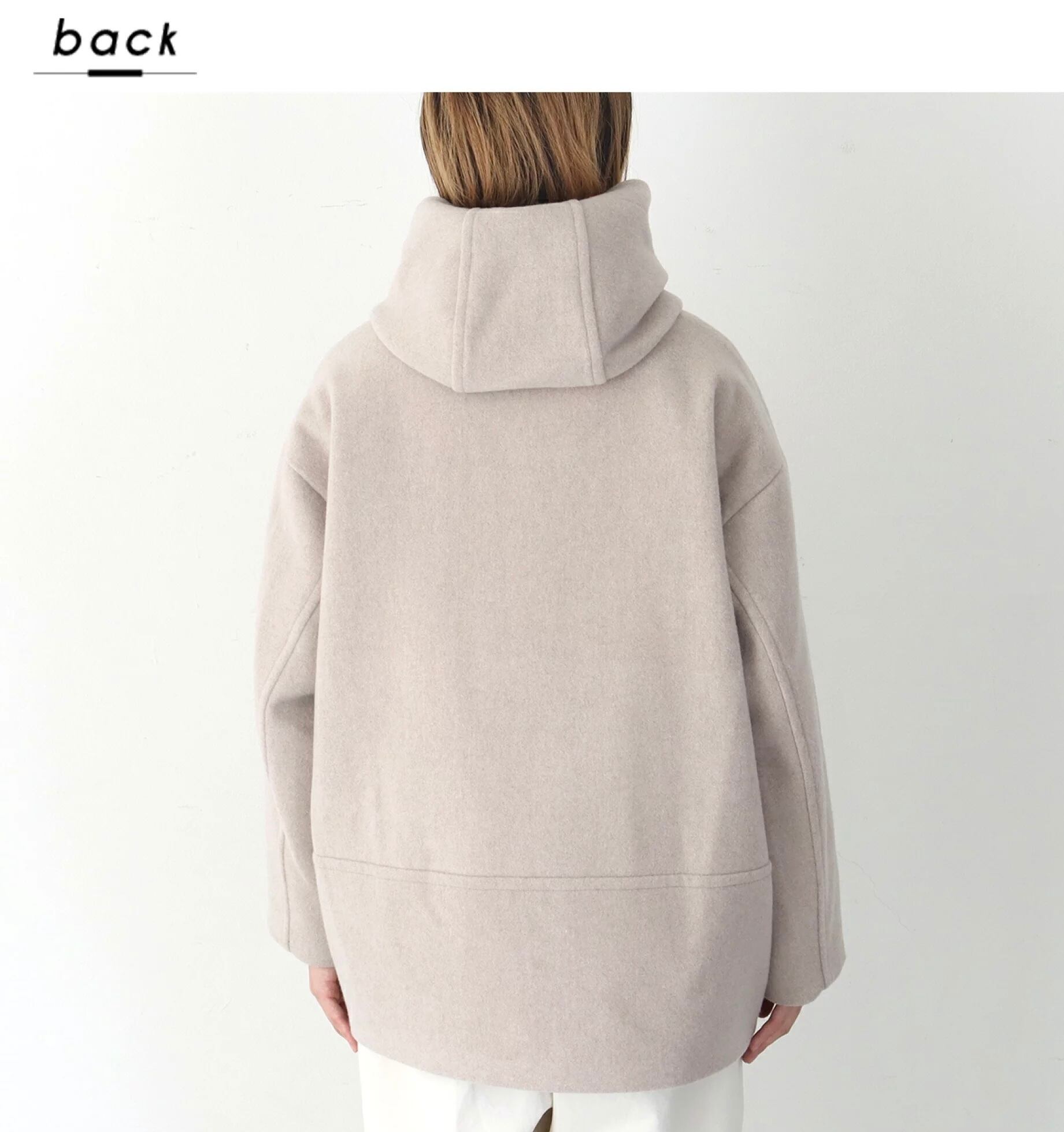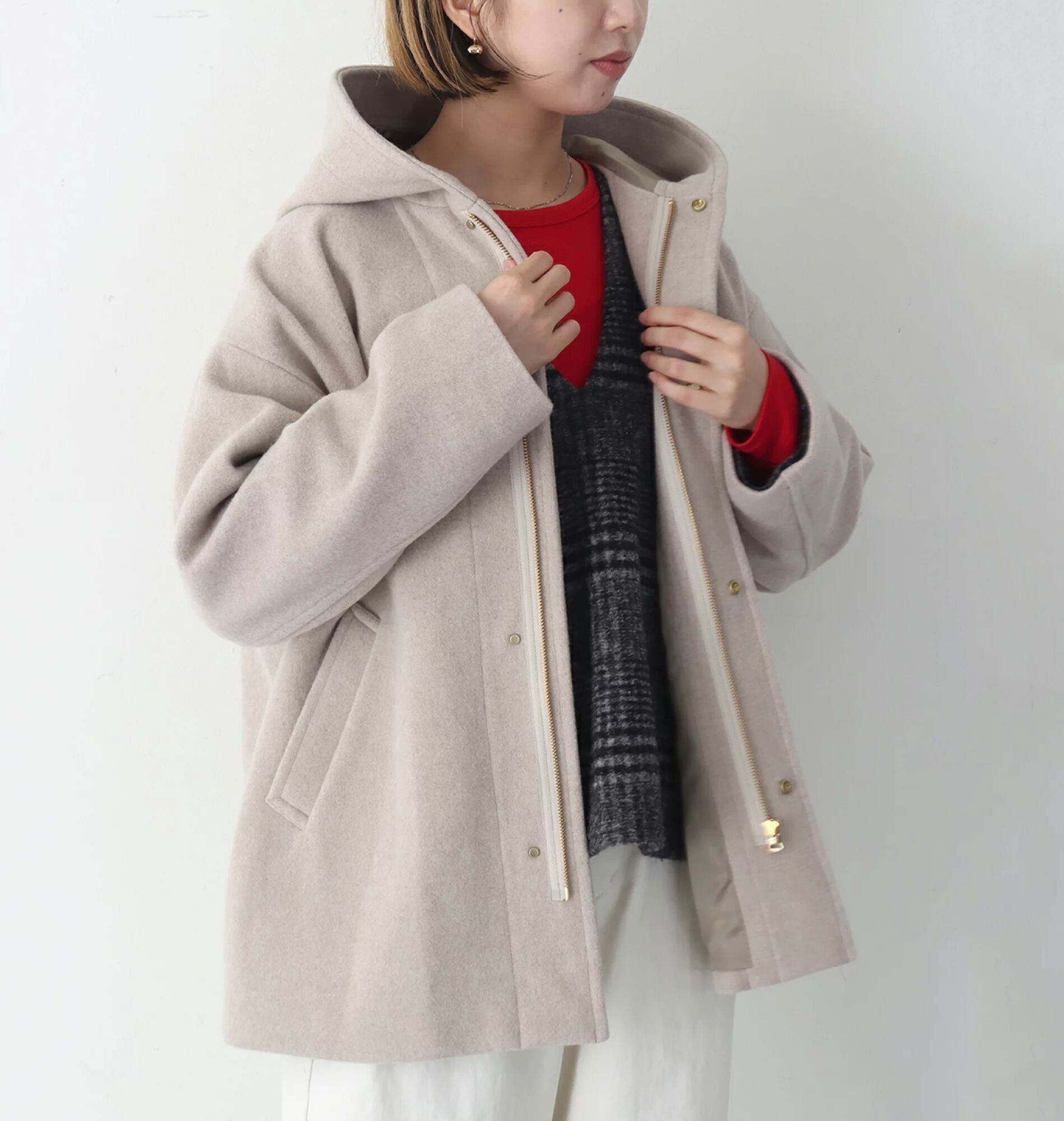 オーバーサイズで身体をすっぽりと包み込むようなフード付きのコートが登場。