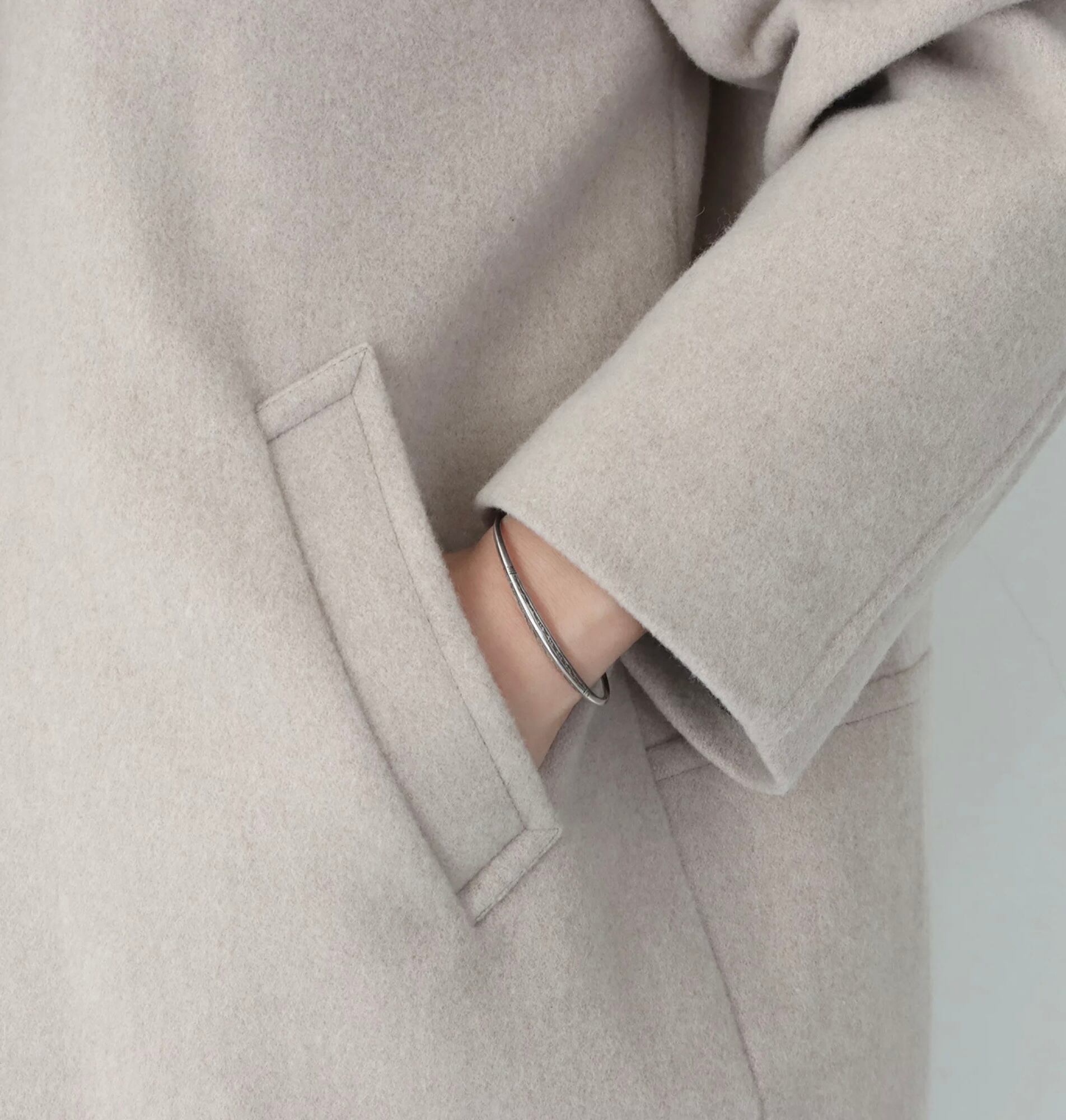 SUPER100の上質原料を使用した、ウール100%ならではの軽さ、暖かさ、柔らかさが特徴の素材を膨らみのあるモッサ仕上げにしました。