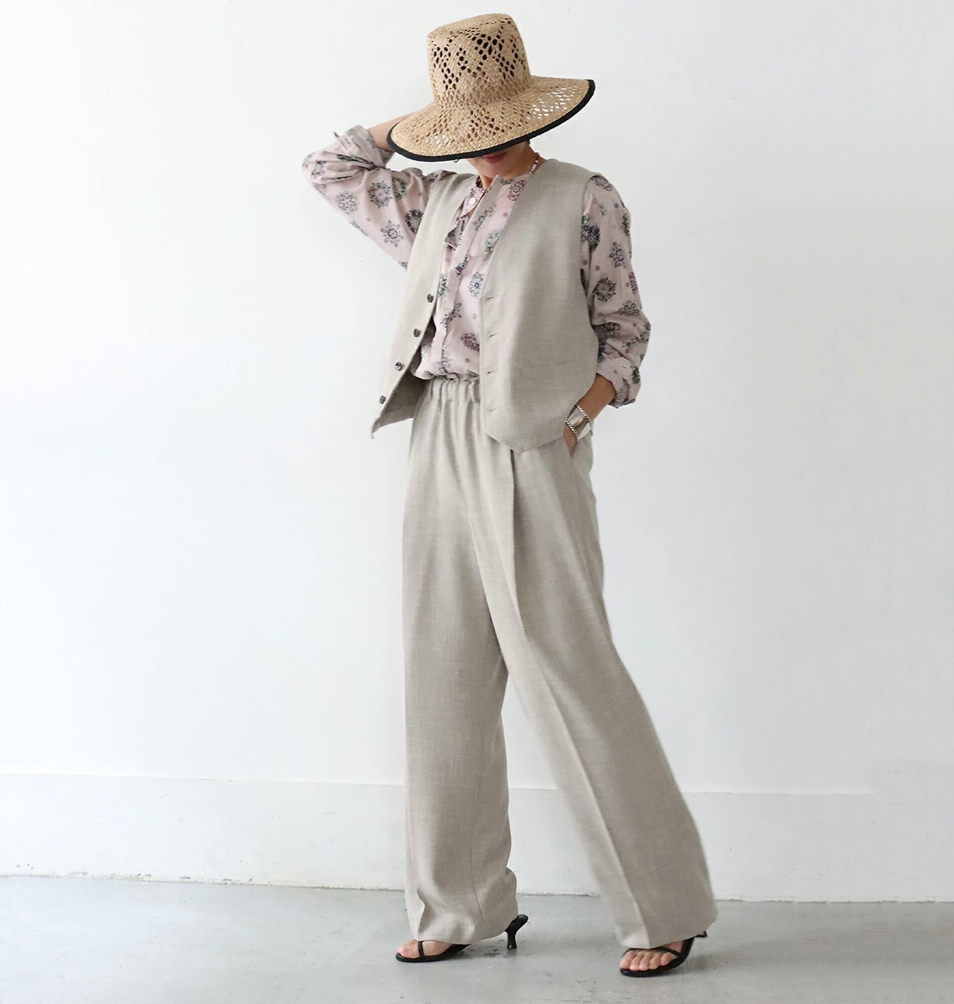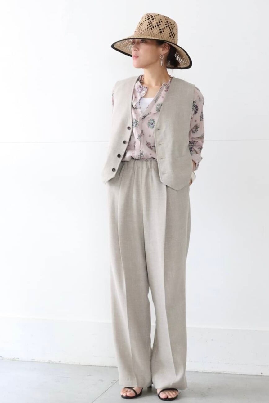 後ろ衿ぐりにギャザーあり。ベストやジャケットのインするレイヤードスタイルもおすすめです。涼しい素材なので盛夏も羽織りとしても使えそうです。