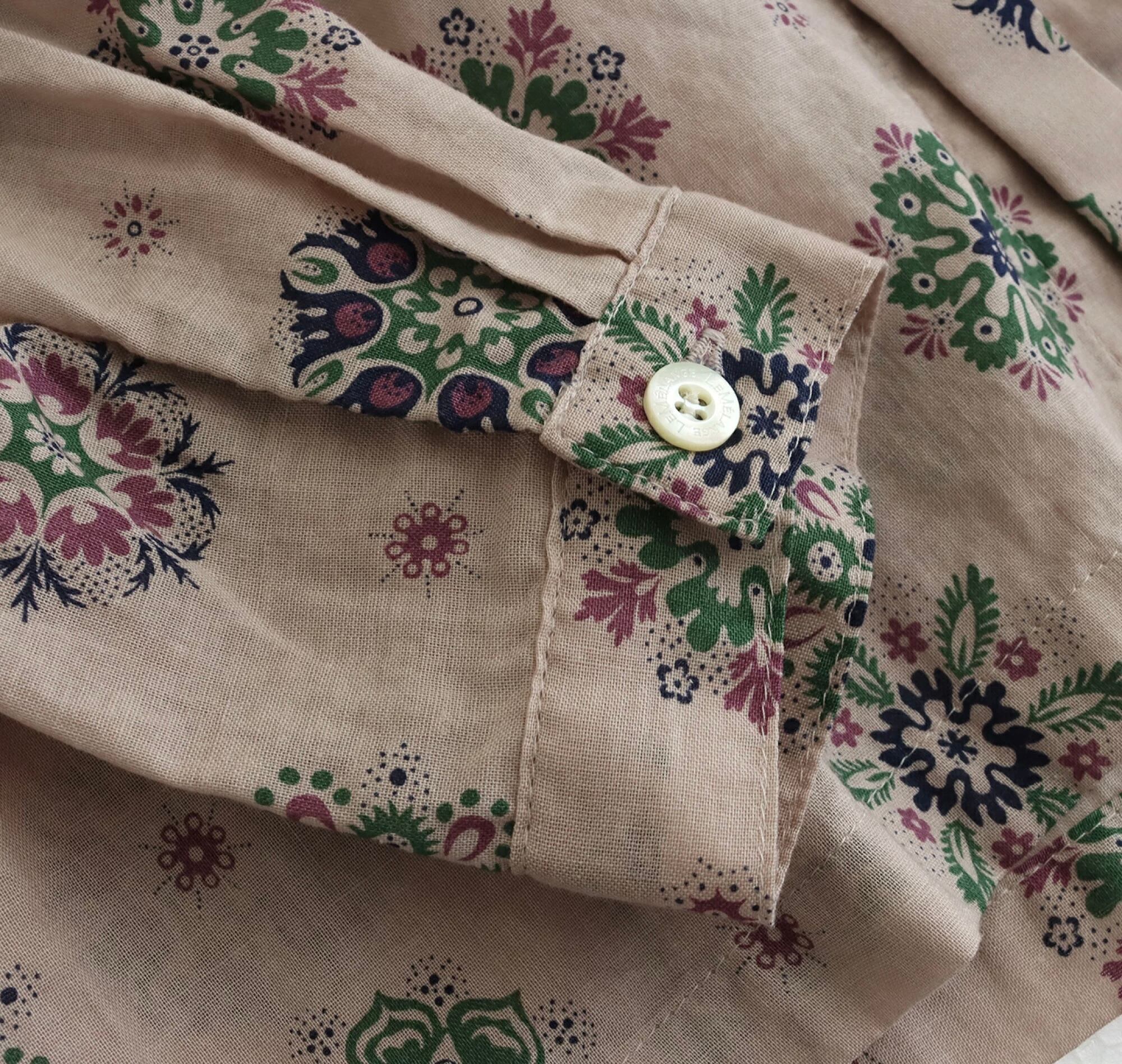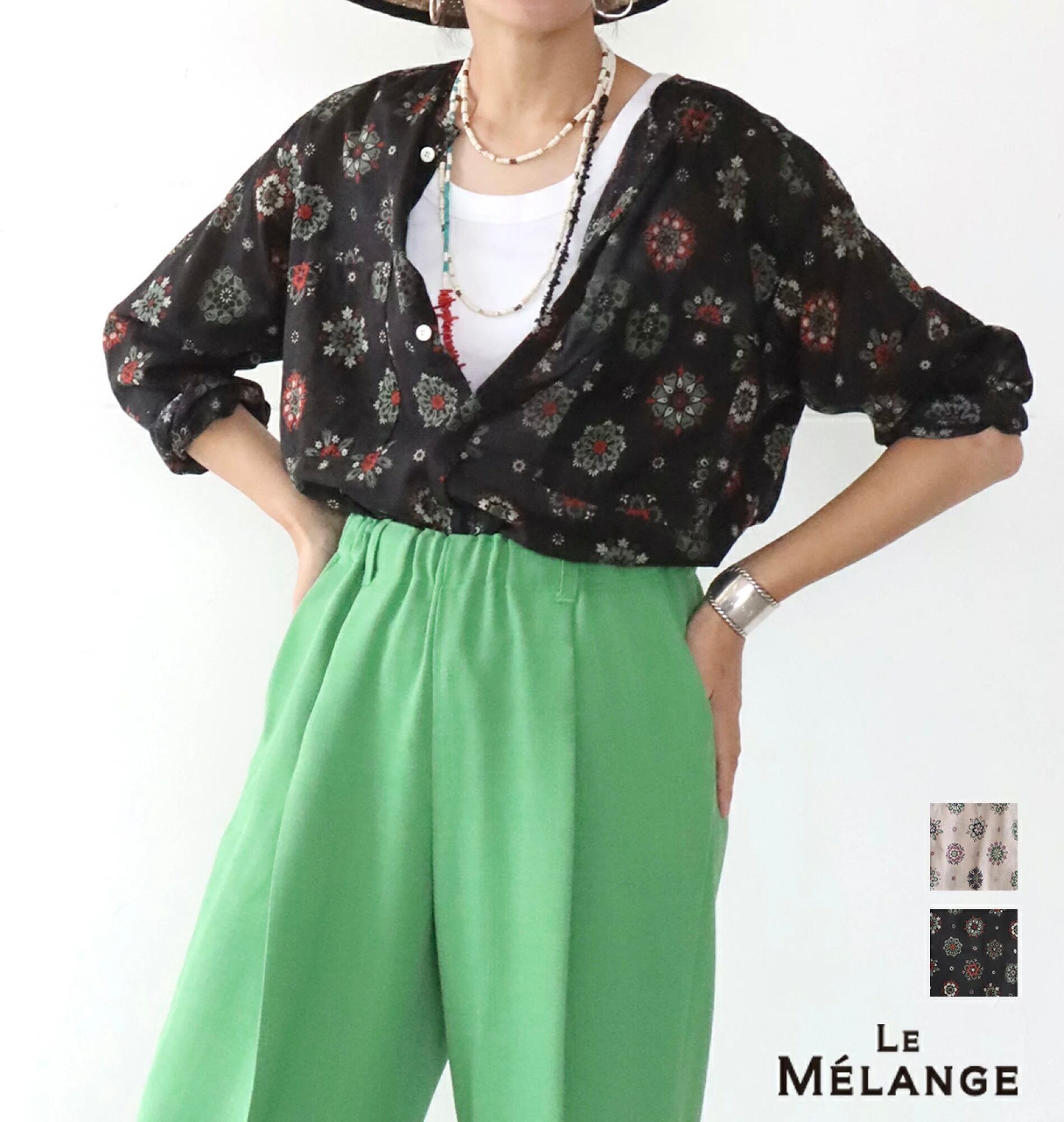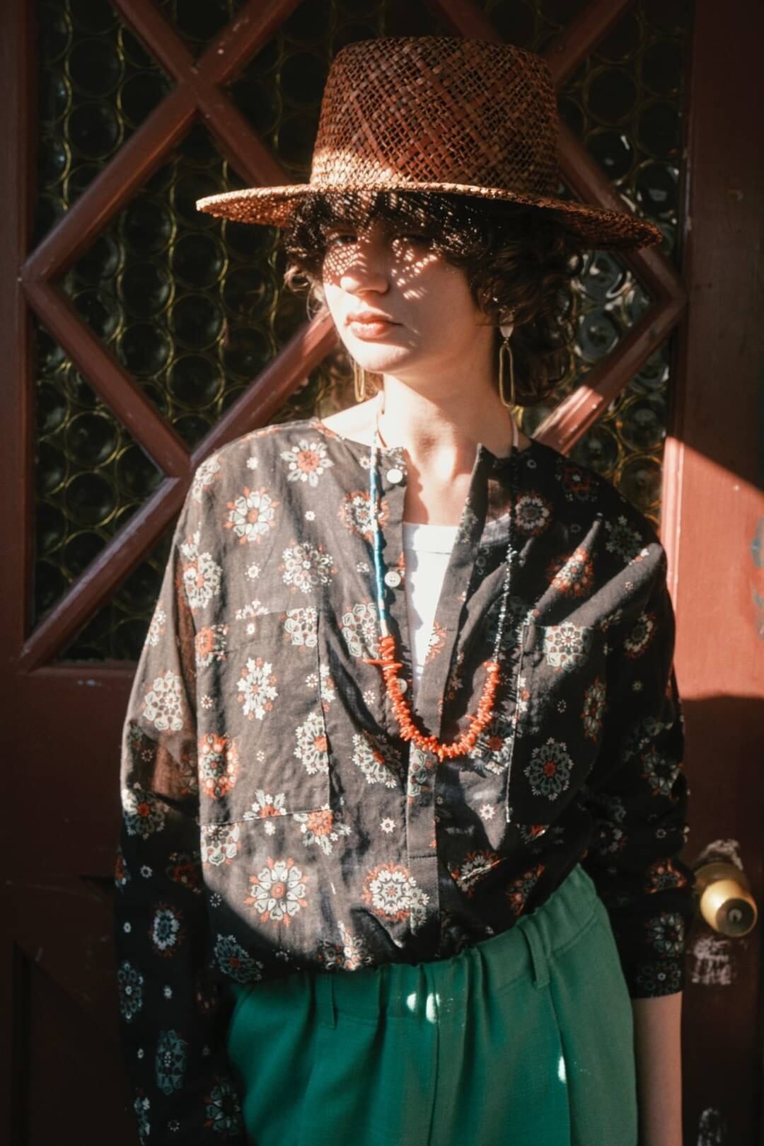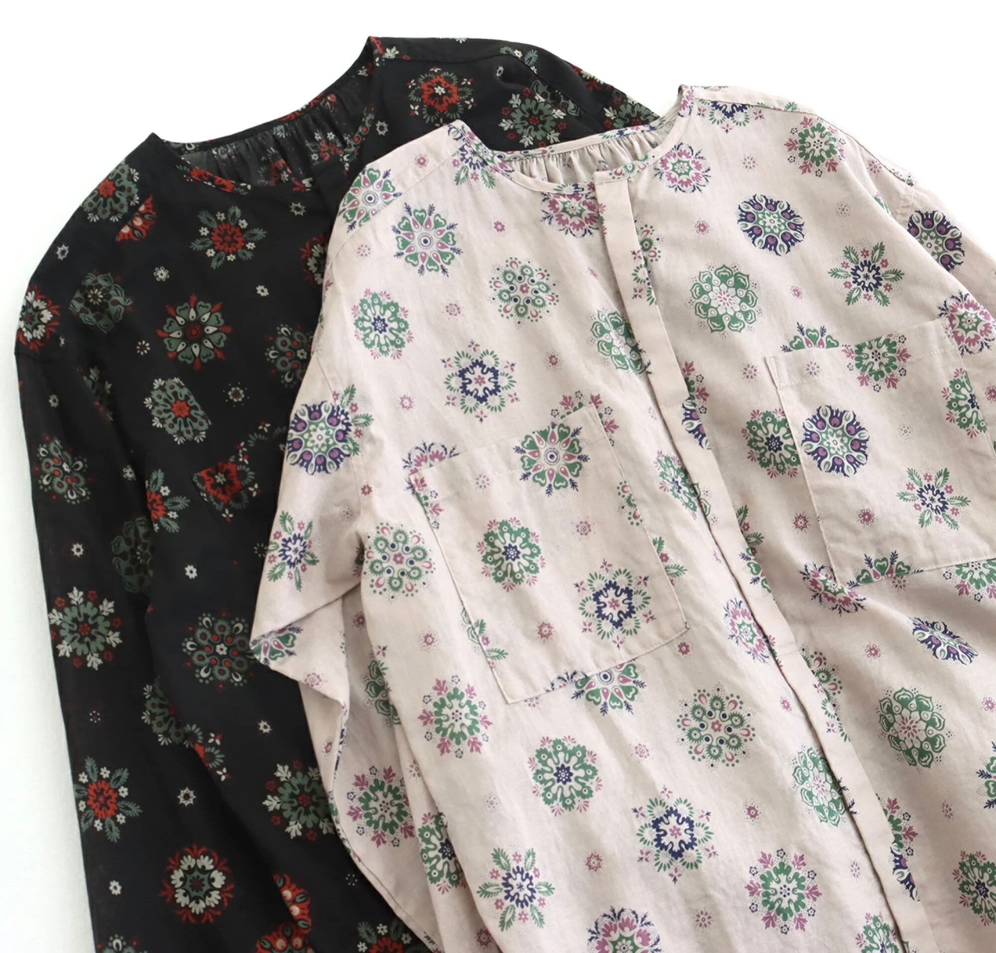 薄くガーゼのような風合いの万華鏡柄ノーカラーブラウス。