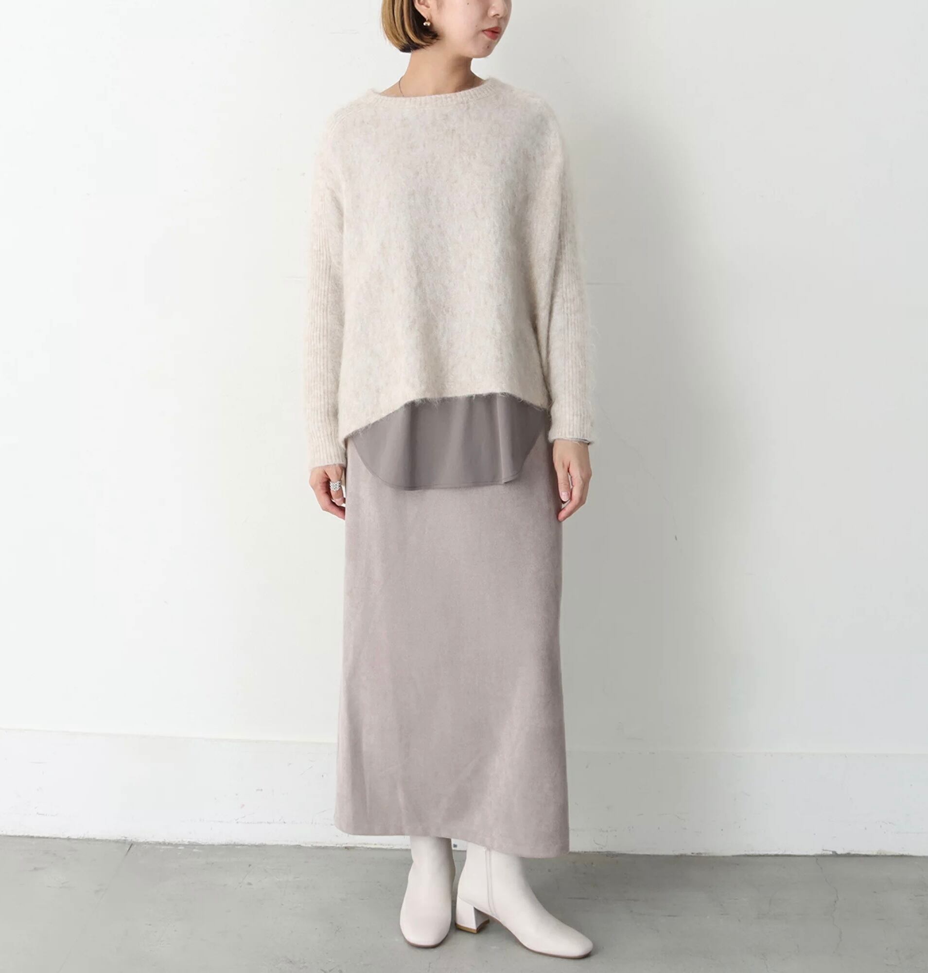 裾ヘムが後ろ下がりの変形デザインであり、後ろはヒップかかかるくらいの丈感で、シンプルながら、空気を含むボリューミーで雰囲気のあるニットプルオーバーは、メイン使いにもしっかりと存在感があります。