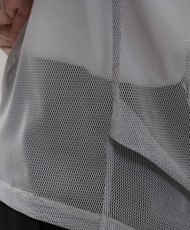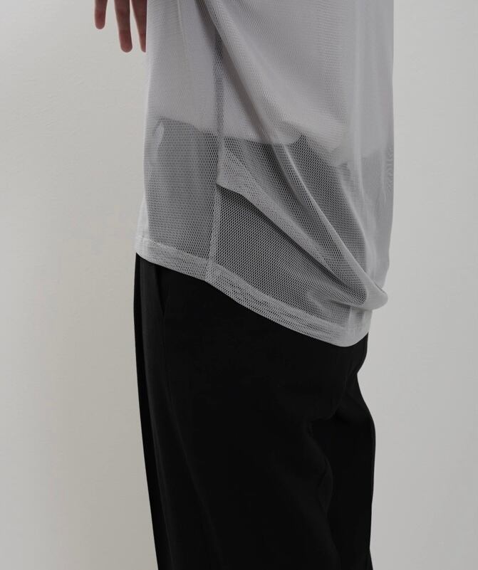インナーにロゴTシャツなどとレイヤードする透け感を生かしたコーディネートがおすすめの商品です。