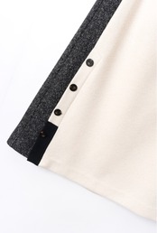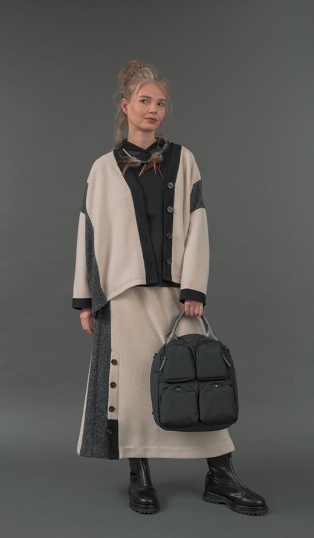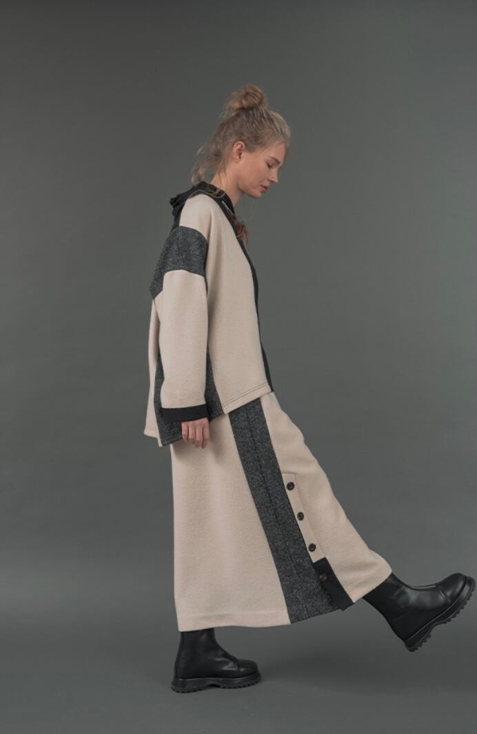 大胆にタテに切り替えた3配色はモード感たっぷり、シワになりにくいニット風ジャージィ素材。