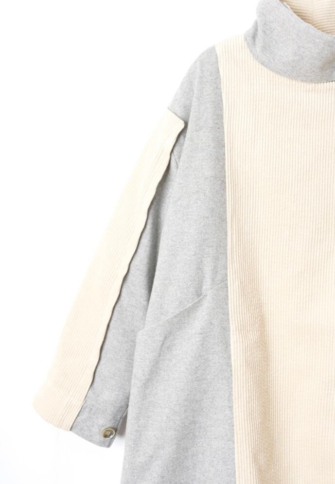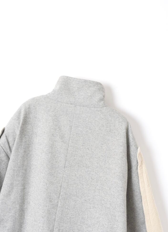 W打合いと袖の切替えがコーデュロイで大き目スタンドカラーは開いたらインパクト大。