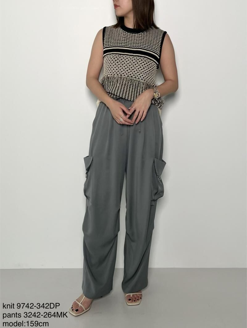 カーゴパンツのディテールを施しきちんと感も持たせつつも、ウエストはゴム仕様でイージーな着心地を実現させました。