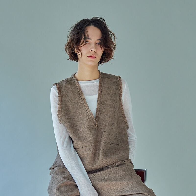 ワンピースのレイヤーとしても同色のパンツとセットアップで着用して大人のクラシカルなムードをより引き立てます。
