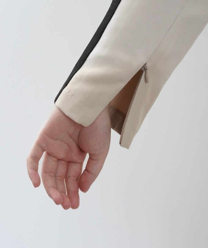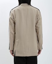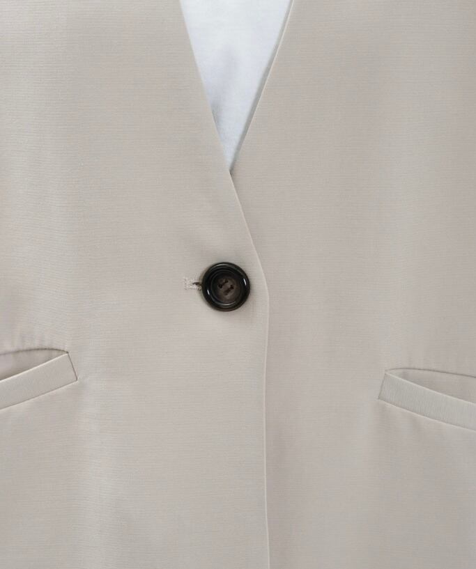 かちっとしたノーカラージャケットながら肩のラインで遊び心を加え、どんなボトムでも合わせやすいカジュアルウエアに昇格したジャケット。