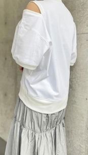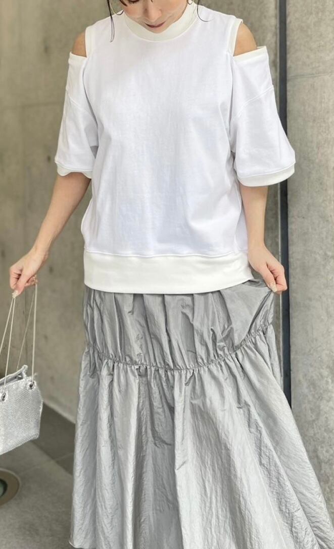 オフショルダーですが、腕を見せすぎない!脇の近くは見せない!開き部分を調整した大人のヘルシーな肩出しデザインにこだわった1枚。