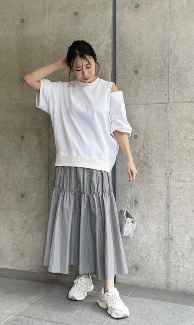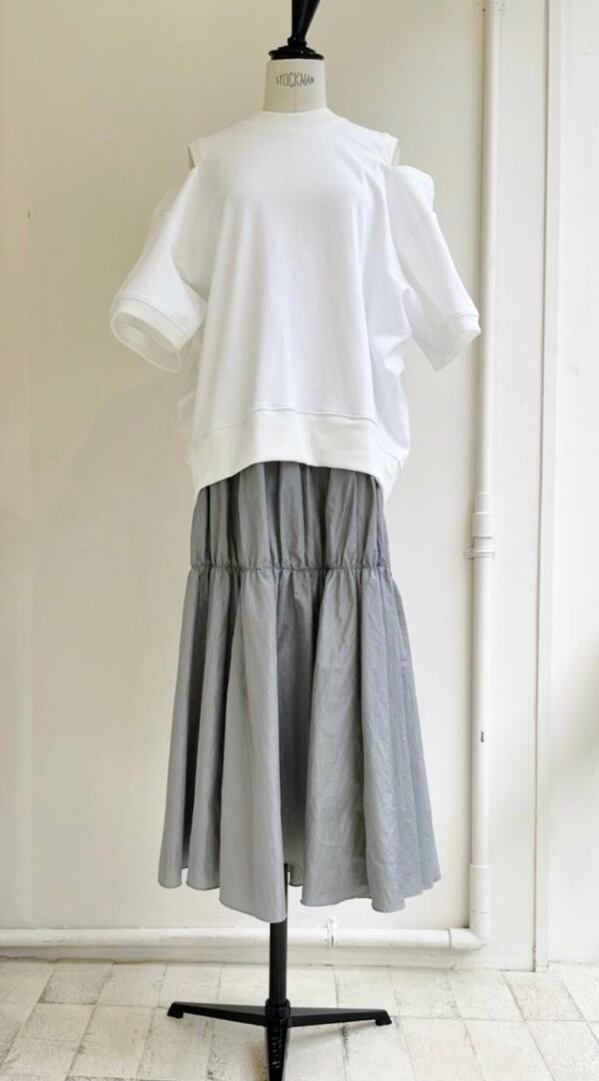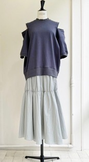 スカートは微光沢感とシャリ感のある素材を使用しておりカジュアルな中にも華やかな印象をあたえてくれます♪