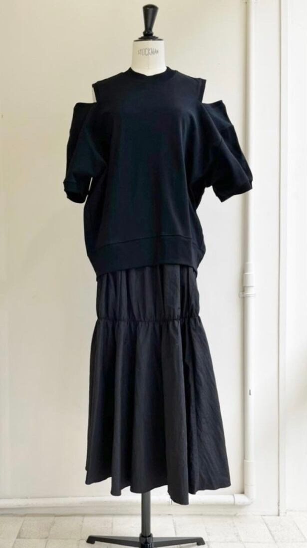 ゆったりシルエットのオフショルTOPSにシャーリングスカートを合わせたようなデザインがらくちん着映えするワンピースです◎