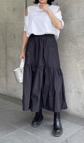 後ろは開いていないオフショルダーデザインなのでずり落ちる心配もなく、肩が見えすぎることもありません。
