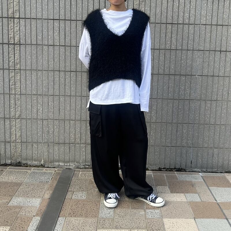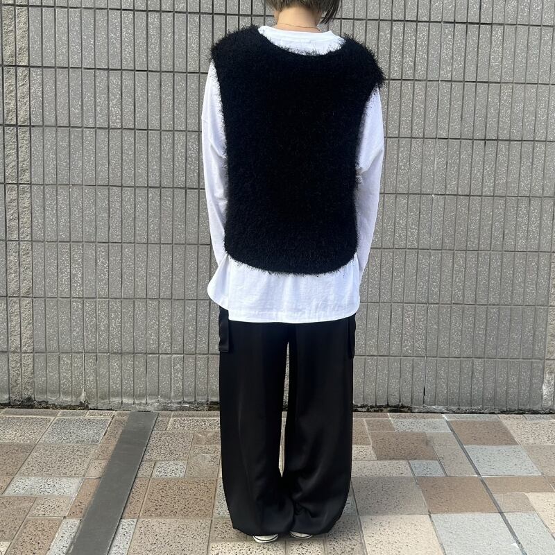 表情のあるフリンジヤーンがコーディネートのアクセントになること間違いなしのフリンジヤーンディープネックベスト。