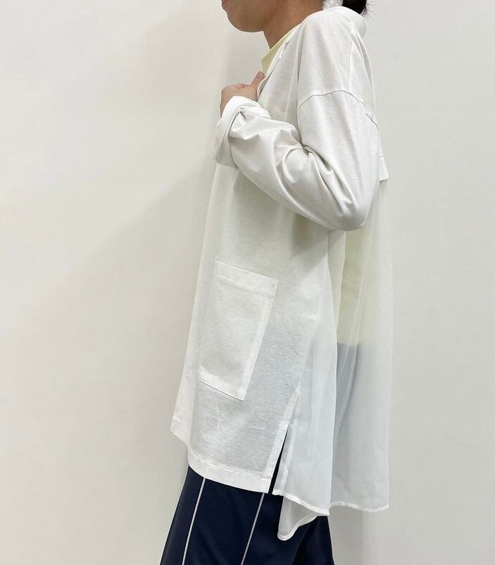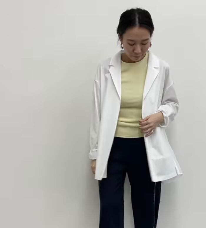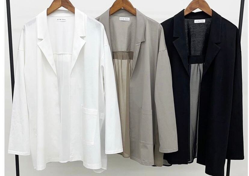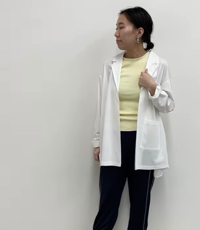 着心地が滑らかになる様にシルケット加工を施したカットソー生地と、仕立て映えのするジョーゼットを組み合わせることで、天竺素材なのにジャケットよりも、よりジャケットらしい見た目に仕上げることが出来ております。