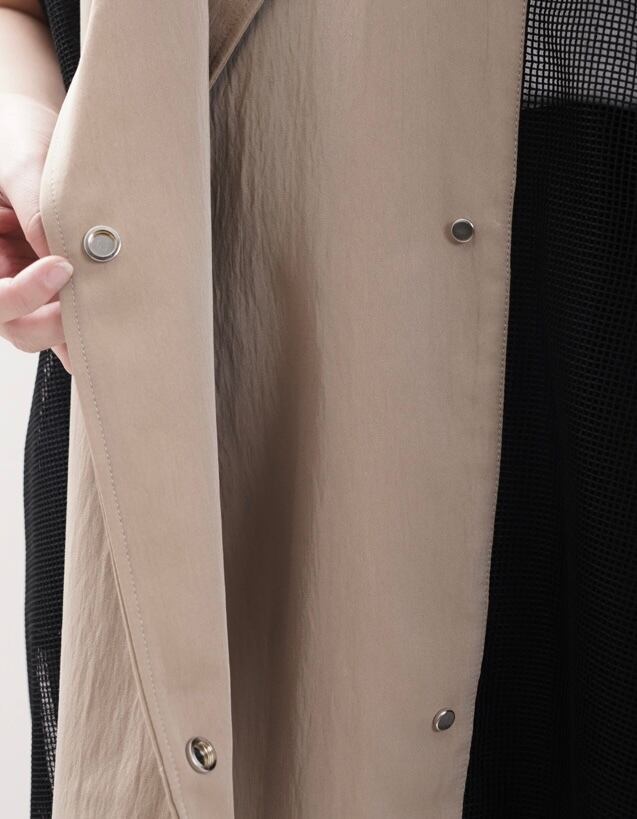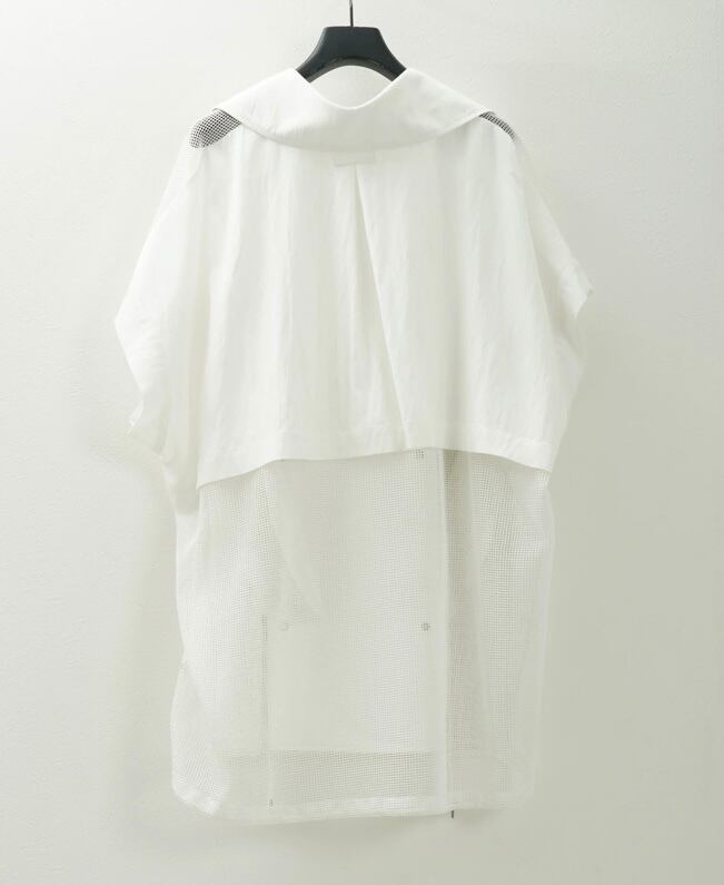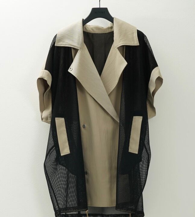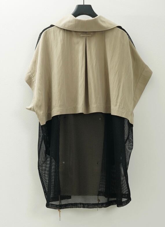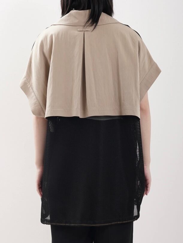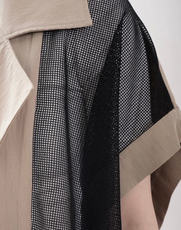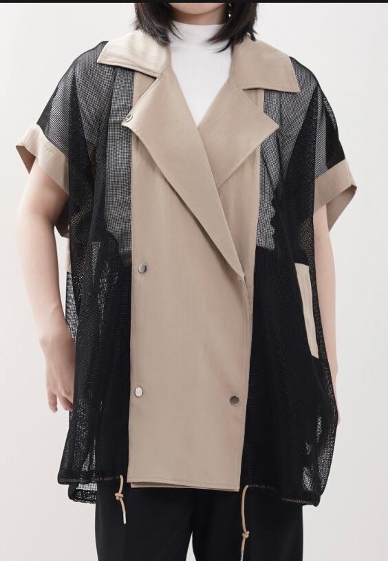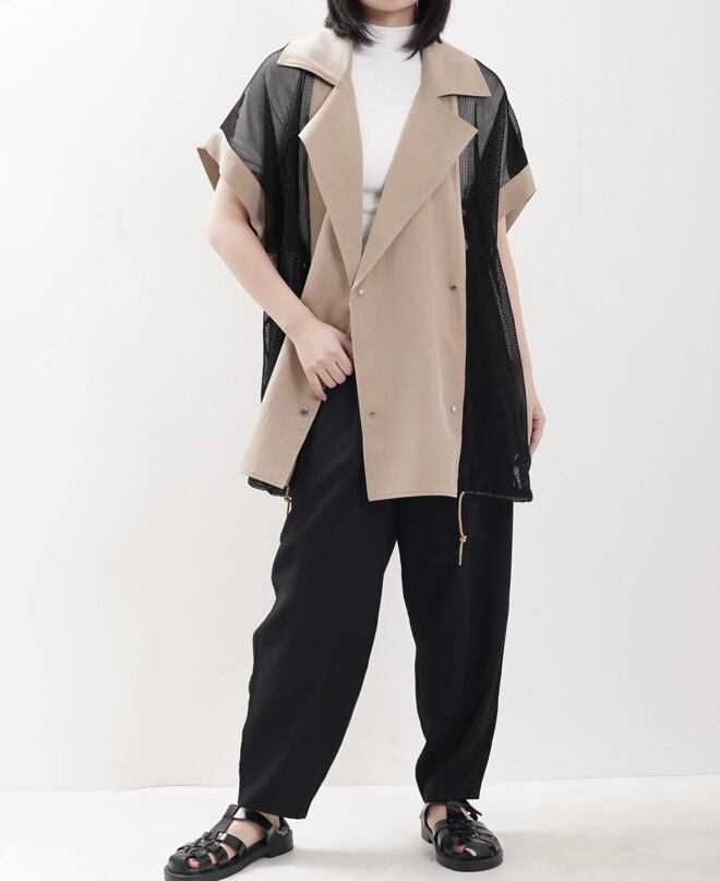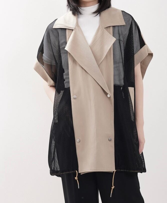 メッシュ素材と上品な合繊素材をドッキングしたオーバーサイズジレ。