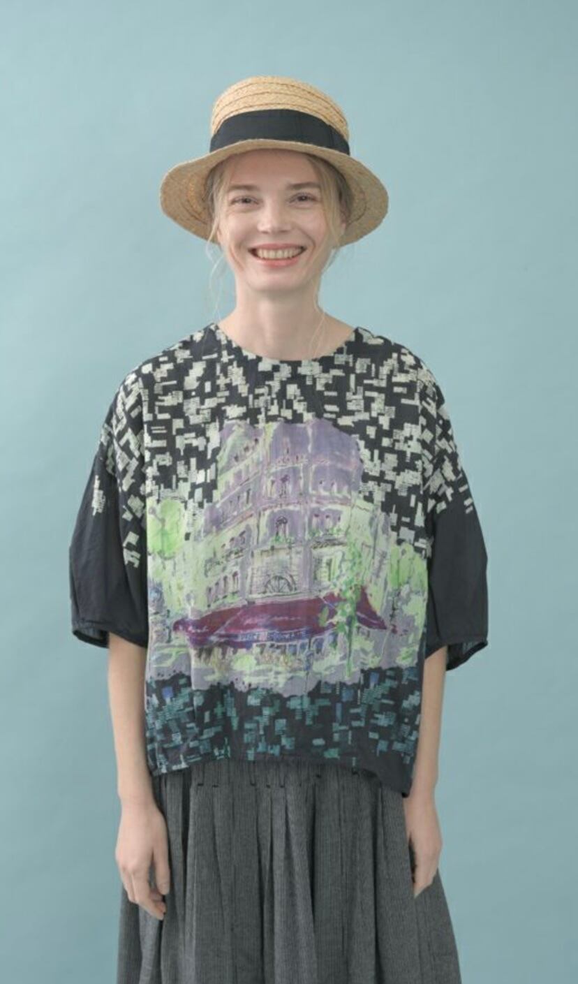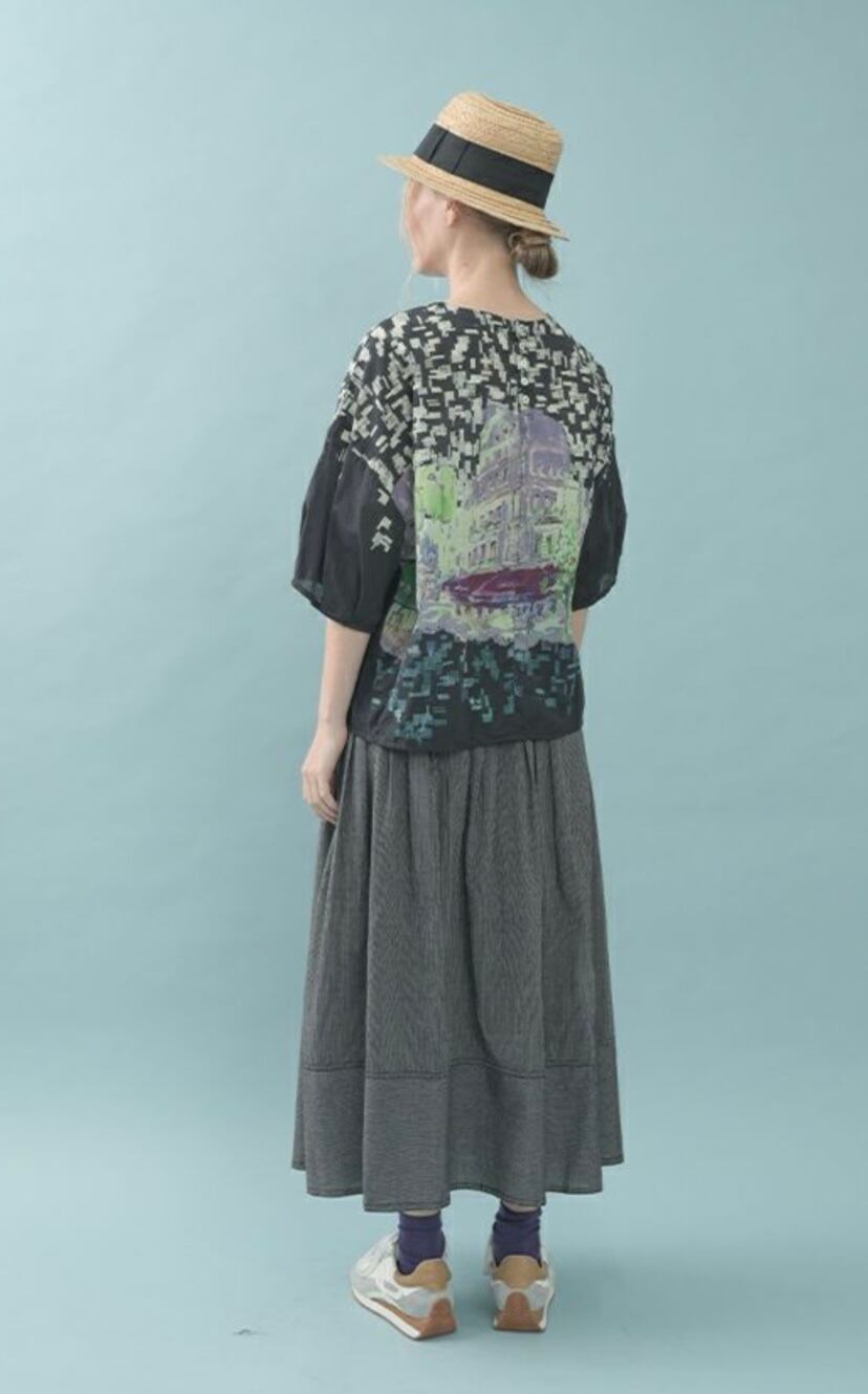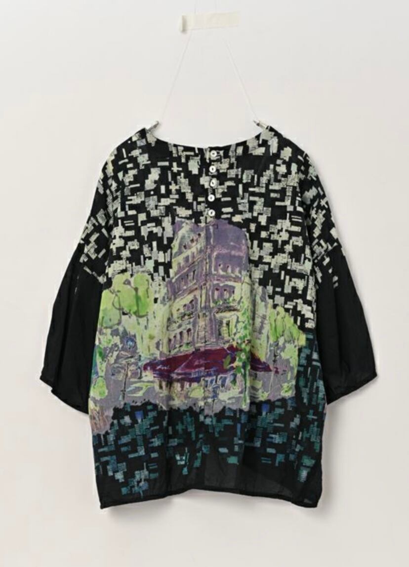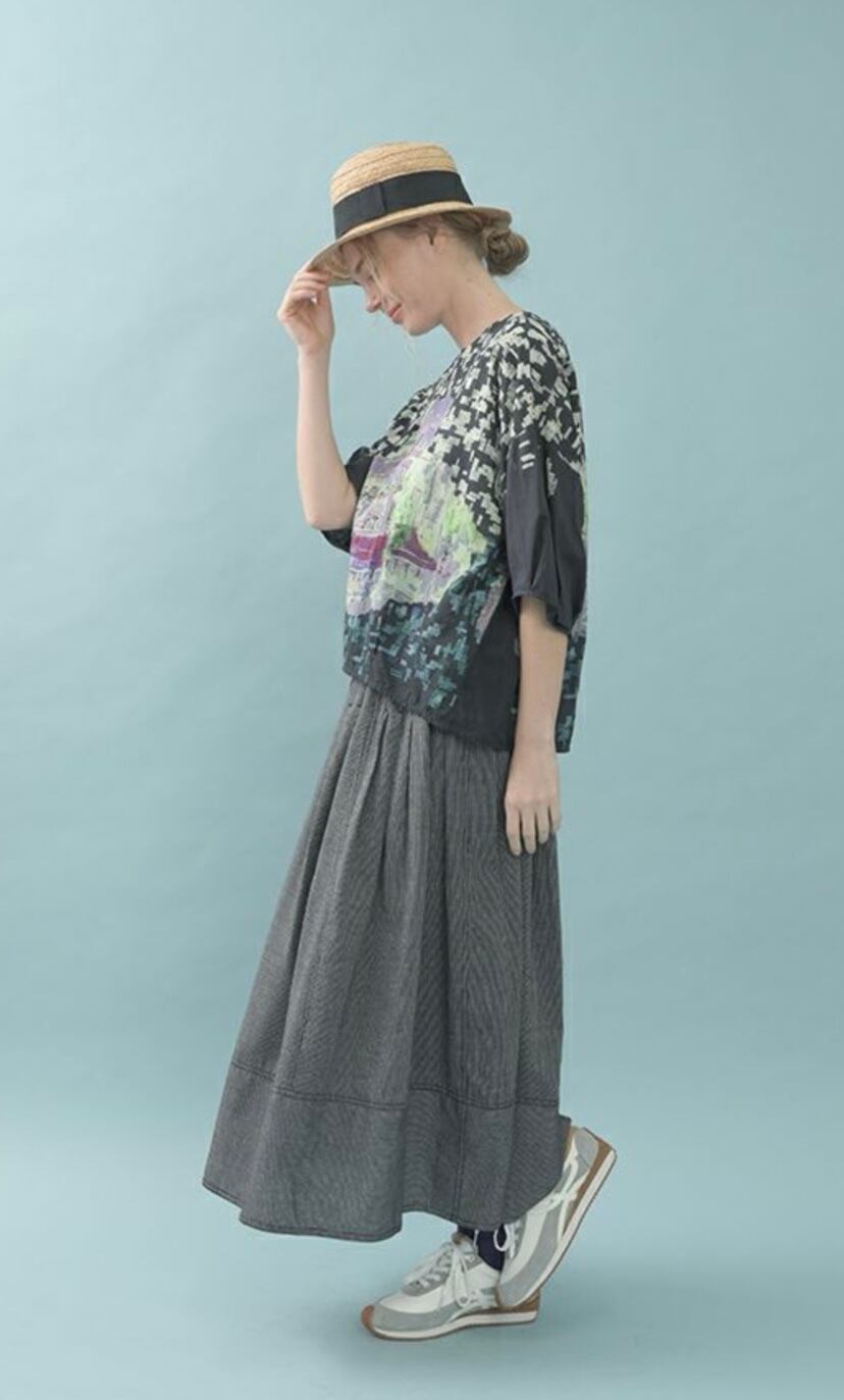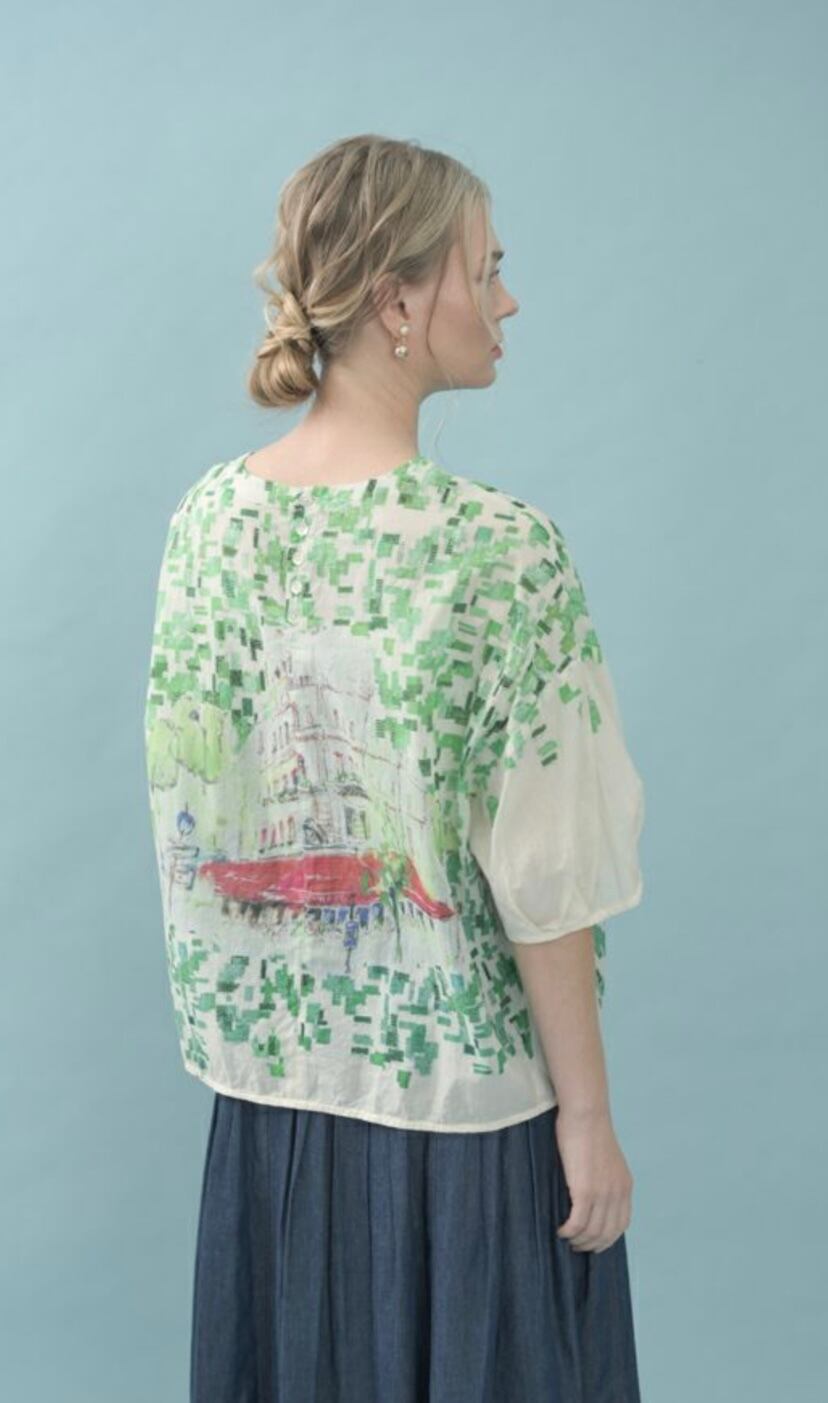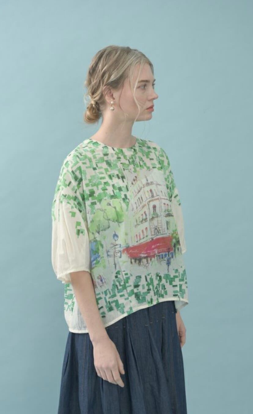 前後に入ったプリントが効果的な被りブラウスで、袖口と裾に入ったタックダーツは優しい丸みと広がらないシルエットを作ってます。