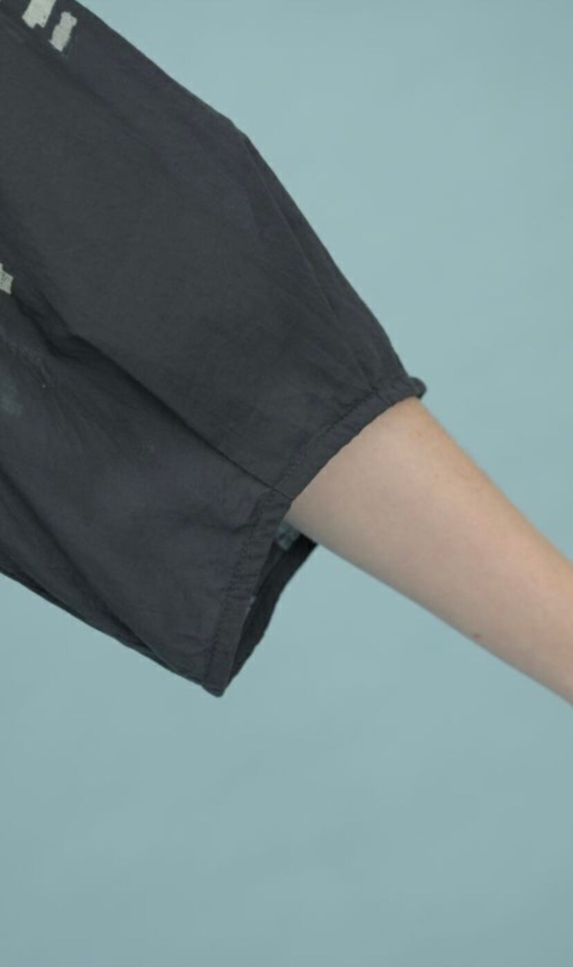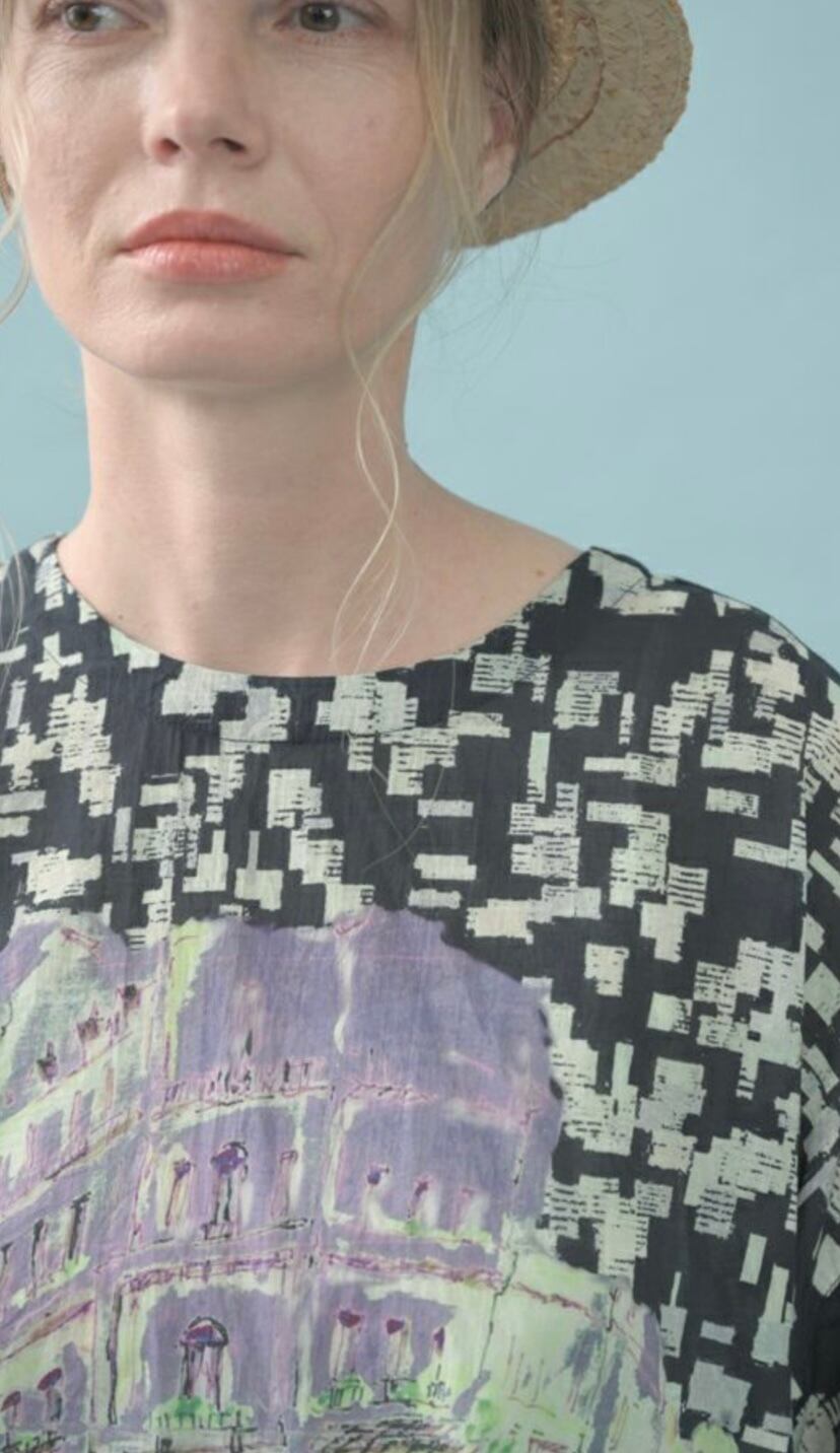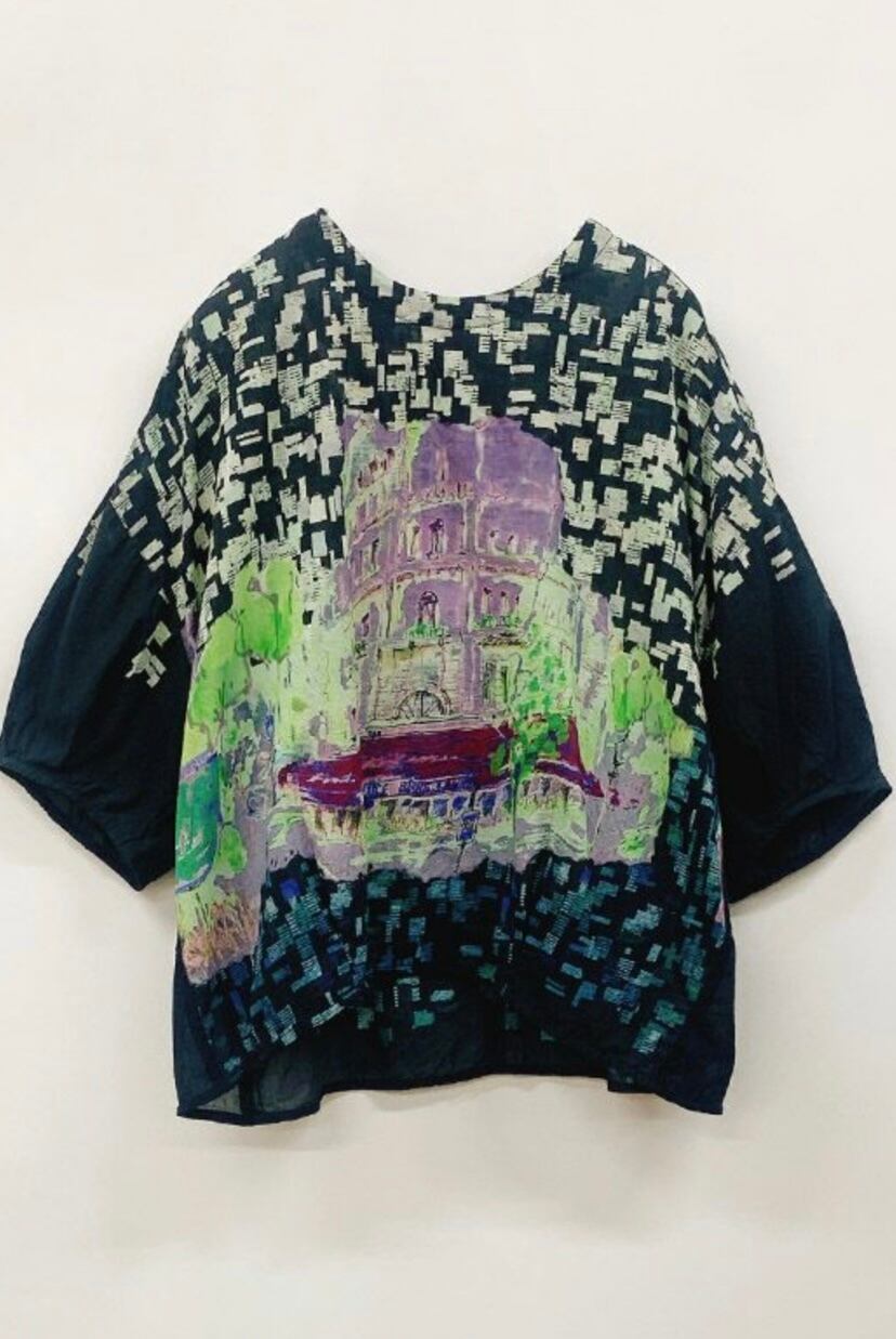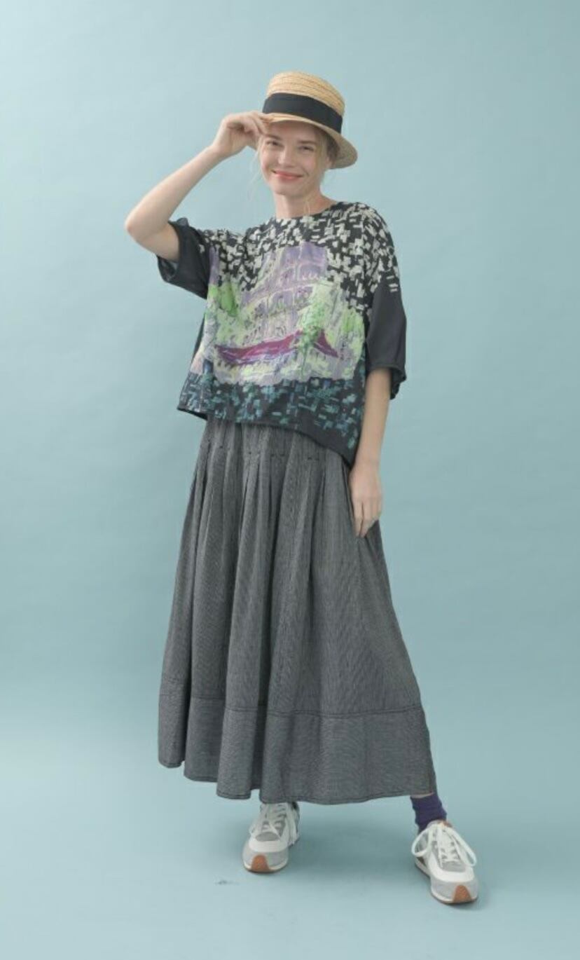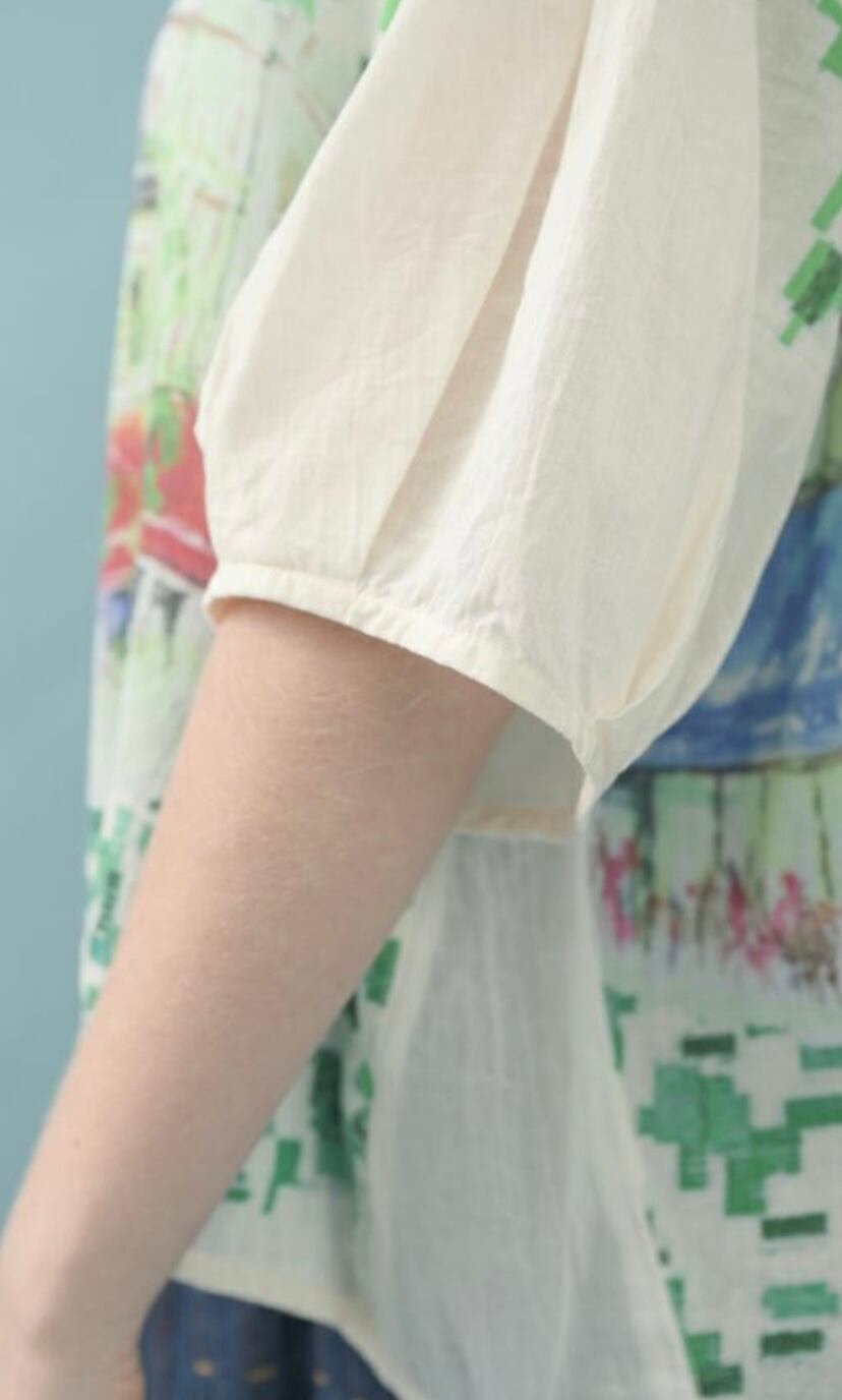 前後に入ったプリントが効果的な被りブラウスで、袖口と裾に入ったタックダーツは優しい丸みと広がらないシルエットを作ってます。