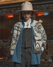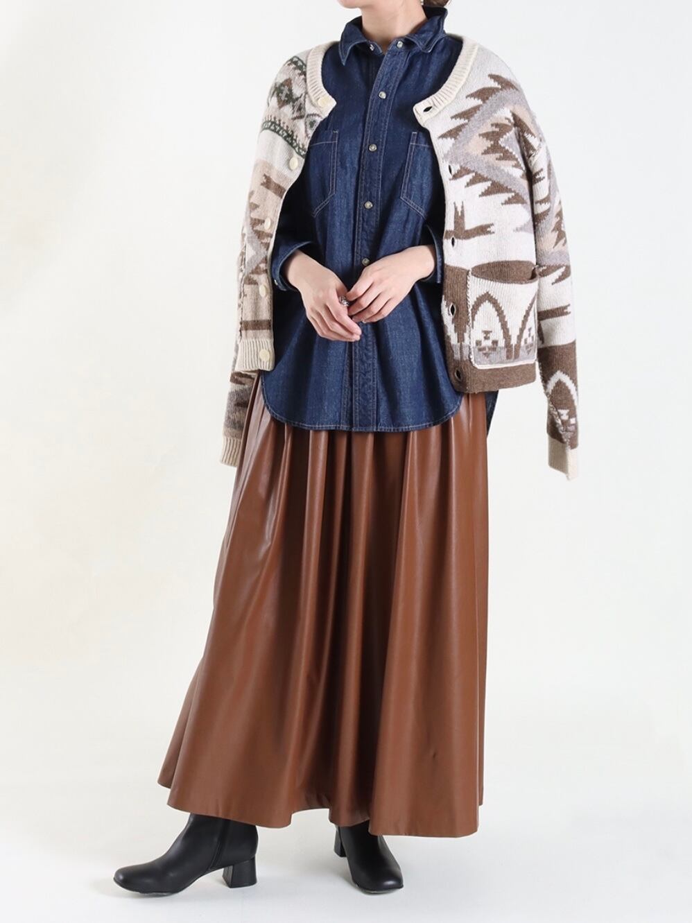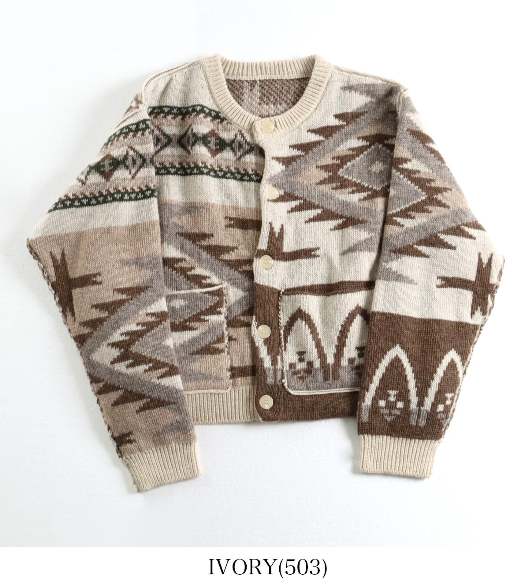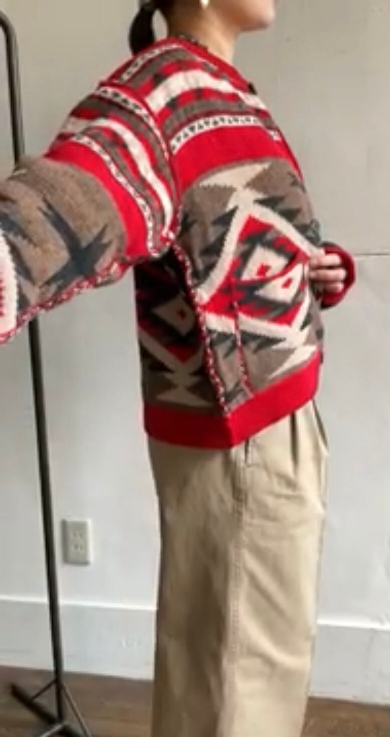 ネイティブ柄のニットをリメイクしたような、パッチワーク風の柄が特長的なカーデ。