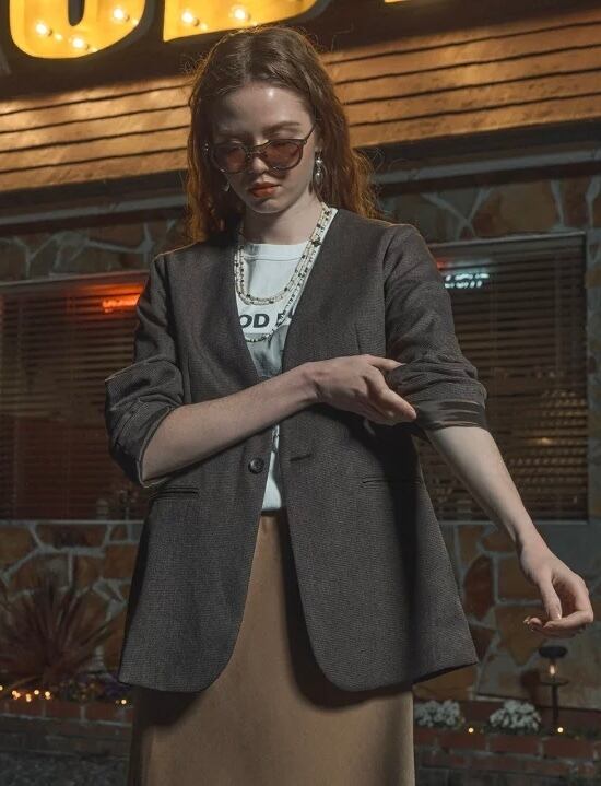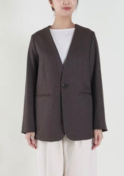 すっきりとしたノーカラーのジャケット。着丈は、ヒップが隠れるくらいの長めです。