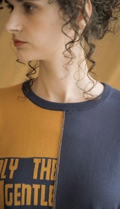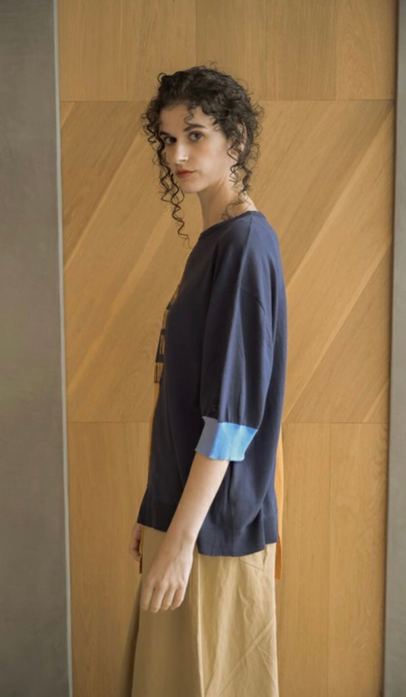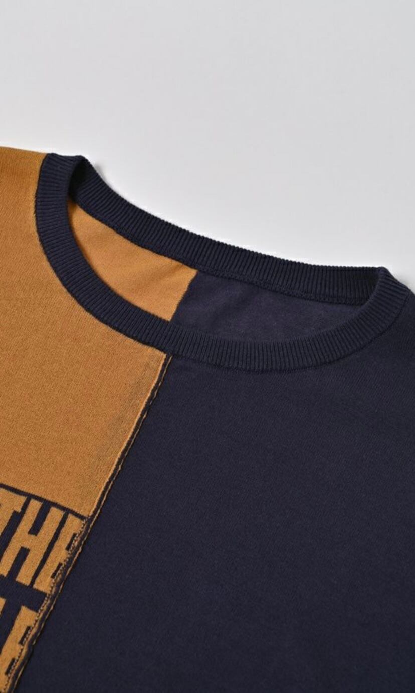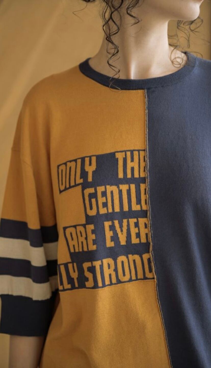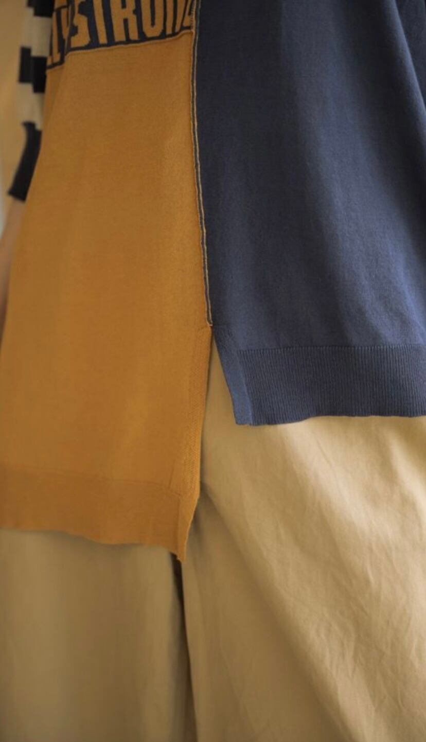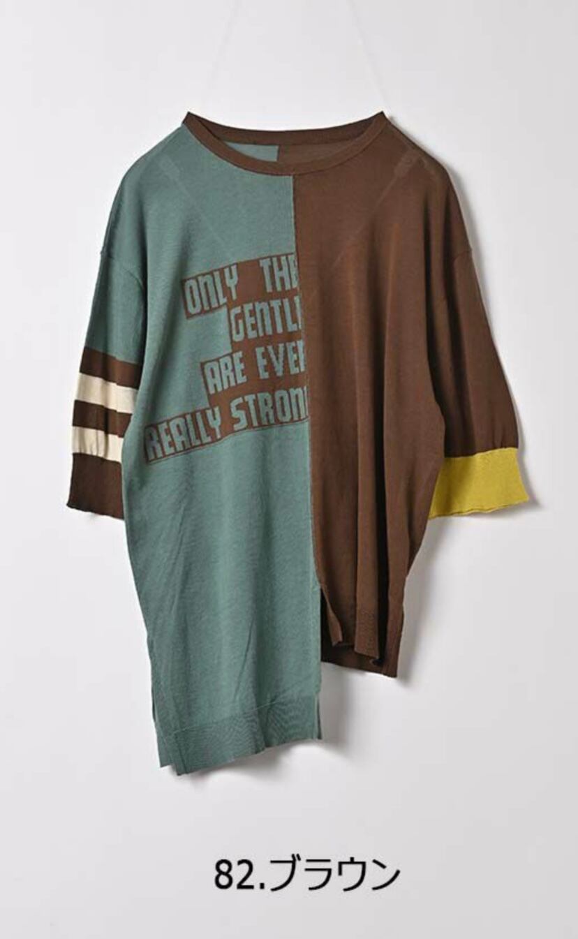 ニットでは珍しいアシンメトリーでロゴ入りのデザイン性の高いニット。