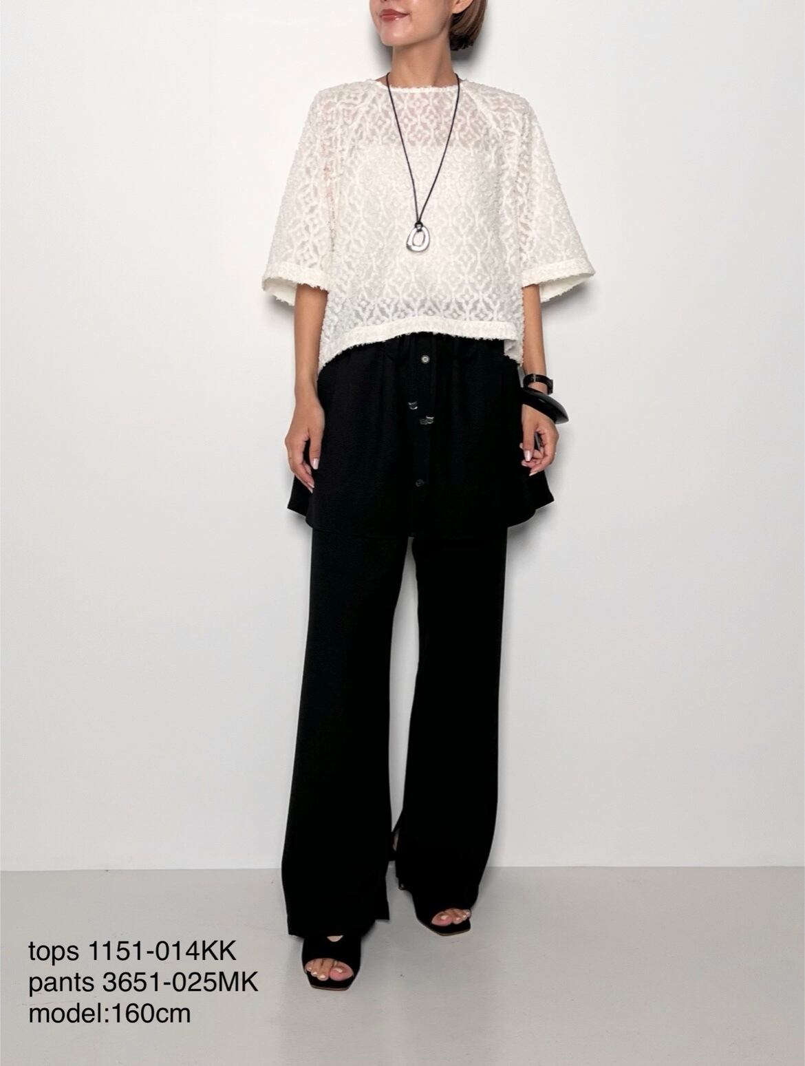 短丈のアイテムとも相性が良く、お尻回りも隠れ、ウエストもイージーで楽にご着用いただけます。