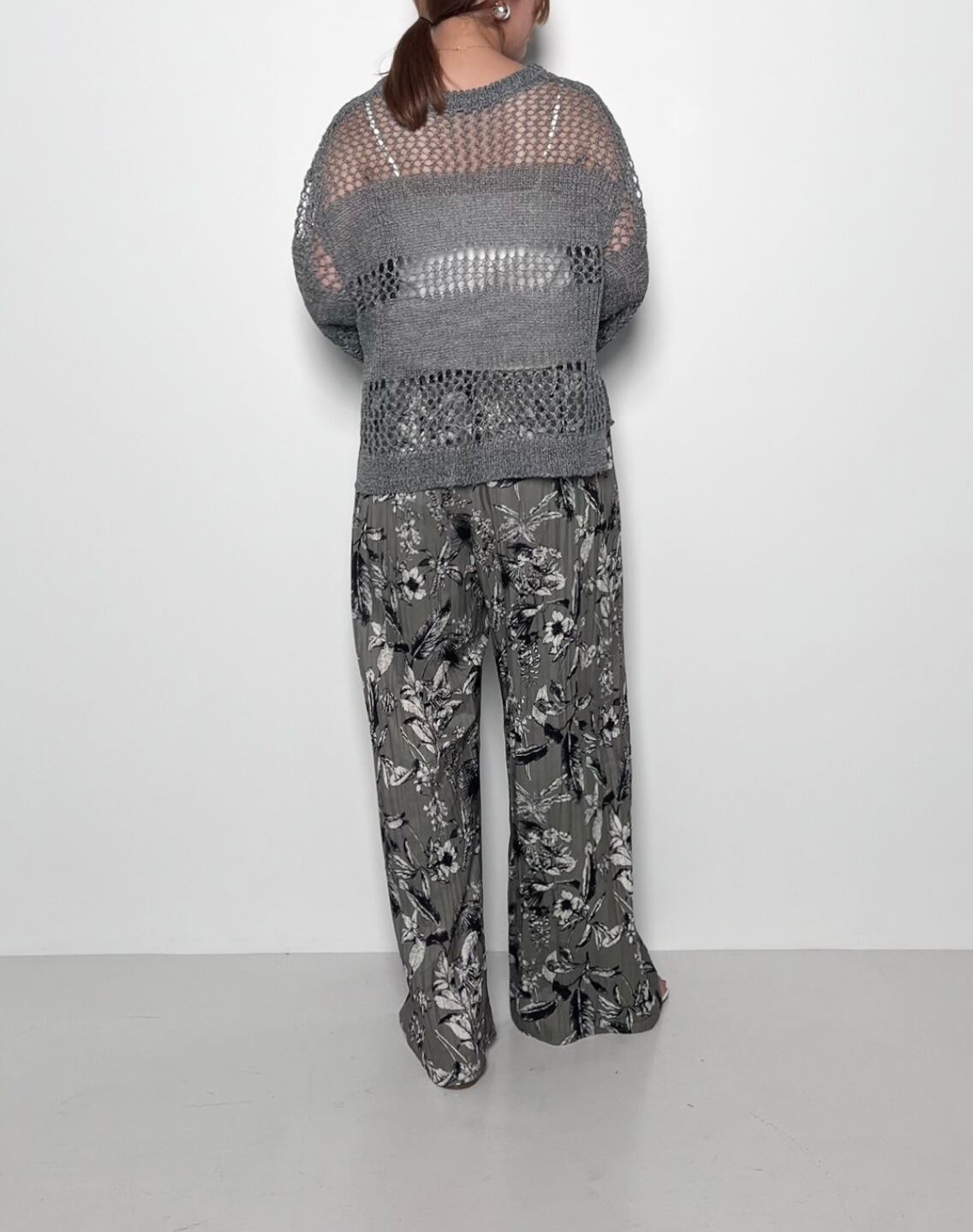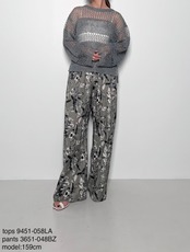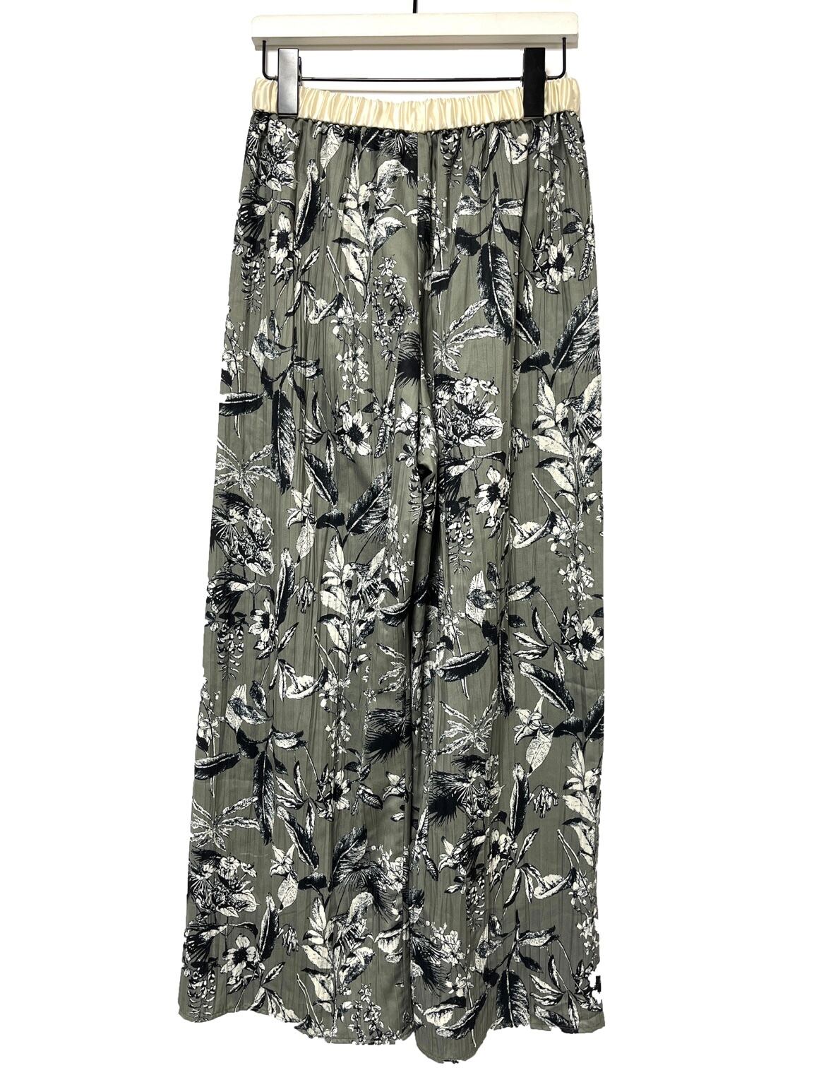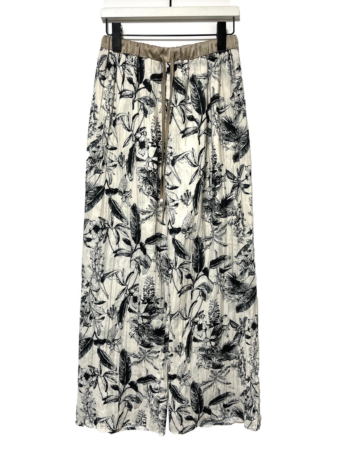 プリーツ加工された生地に大人っぽいリーフ柄プリントされた目新しい素材を使用したイージーパンツになります。