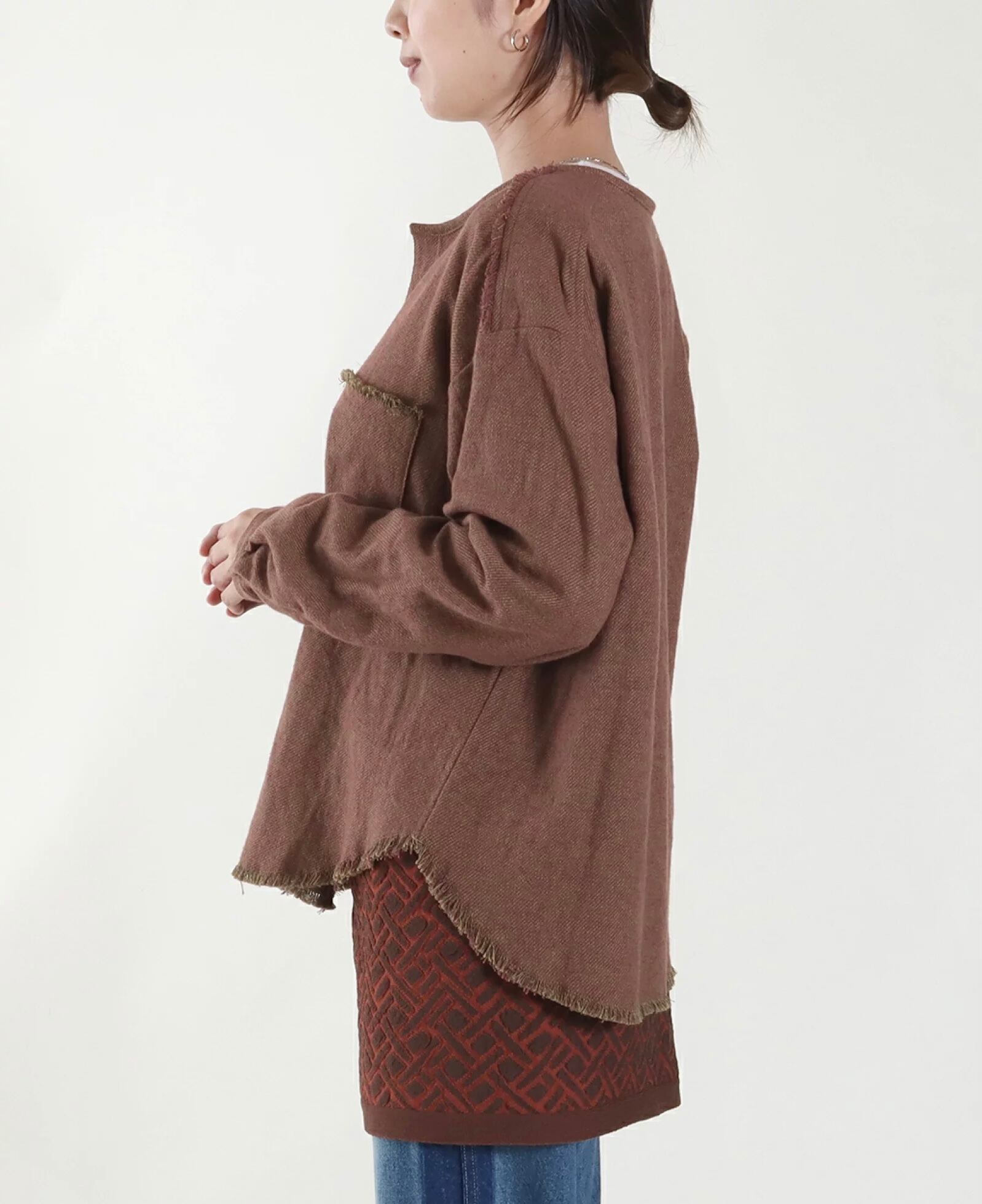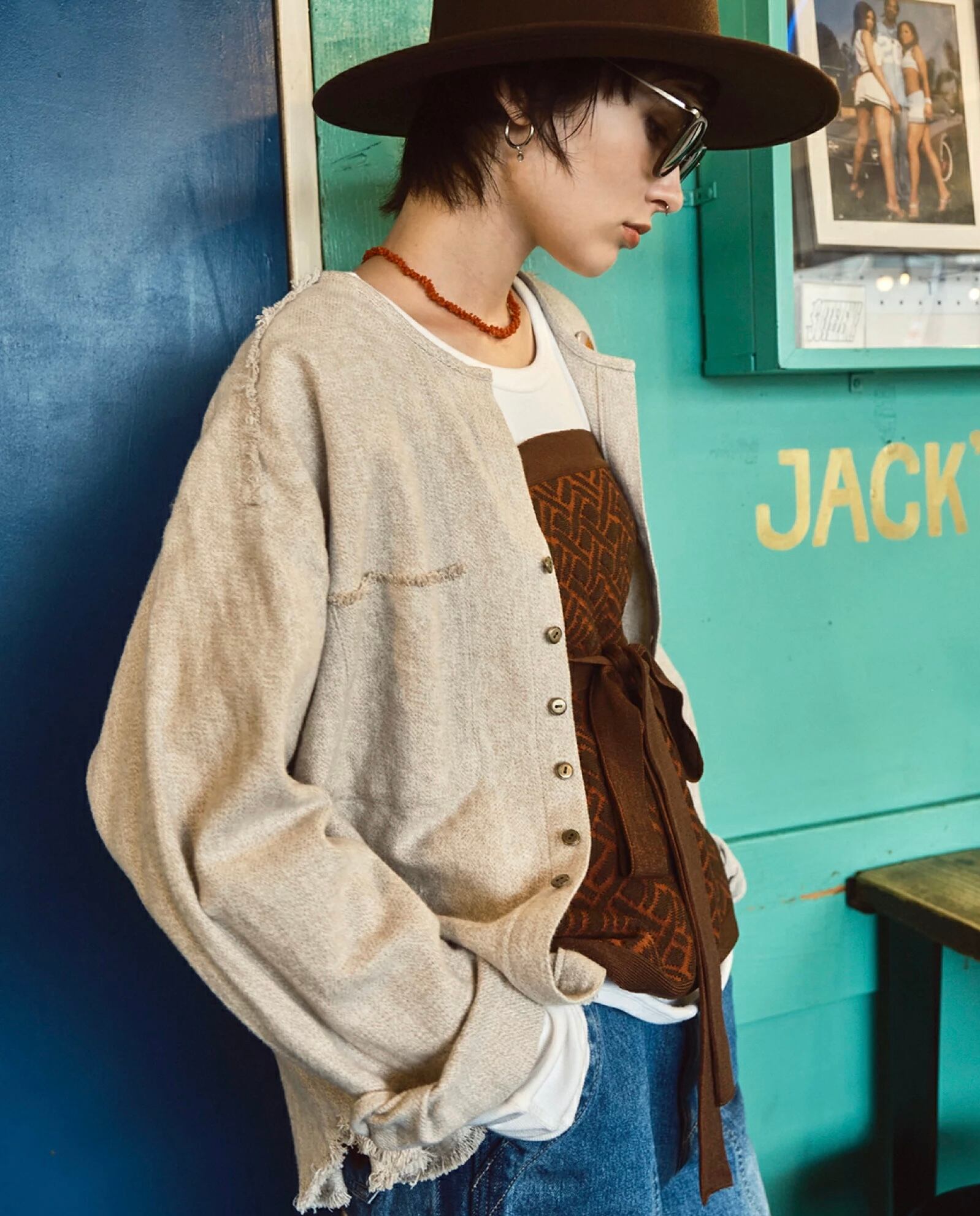 フロントの小さなメタル釦と肩ヨーク、ポケット口、裾ヘムのフリンジ始末がポイント