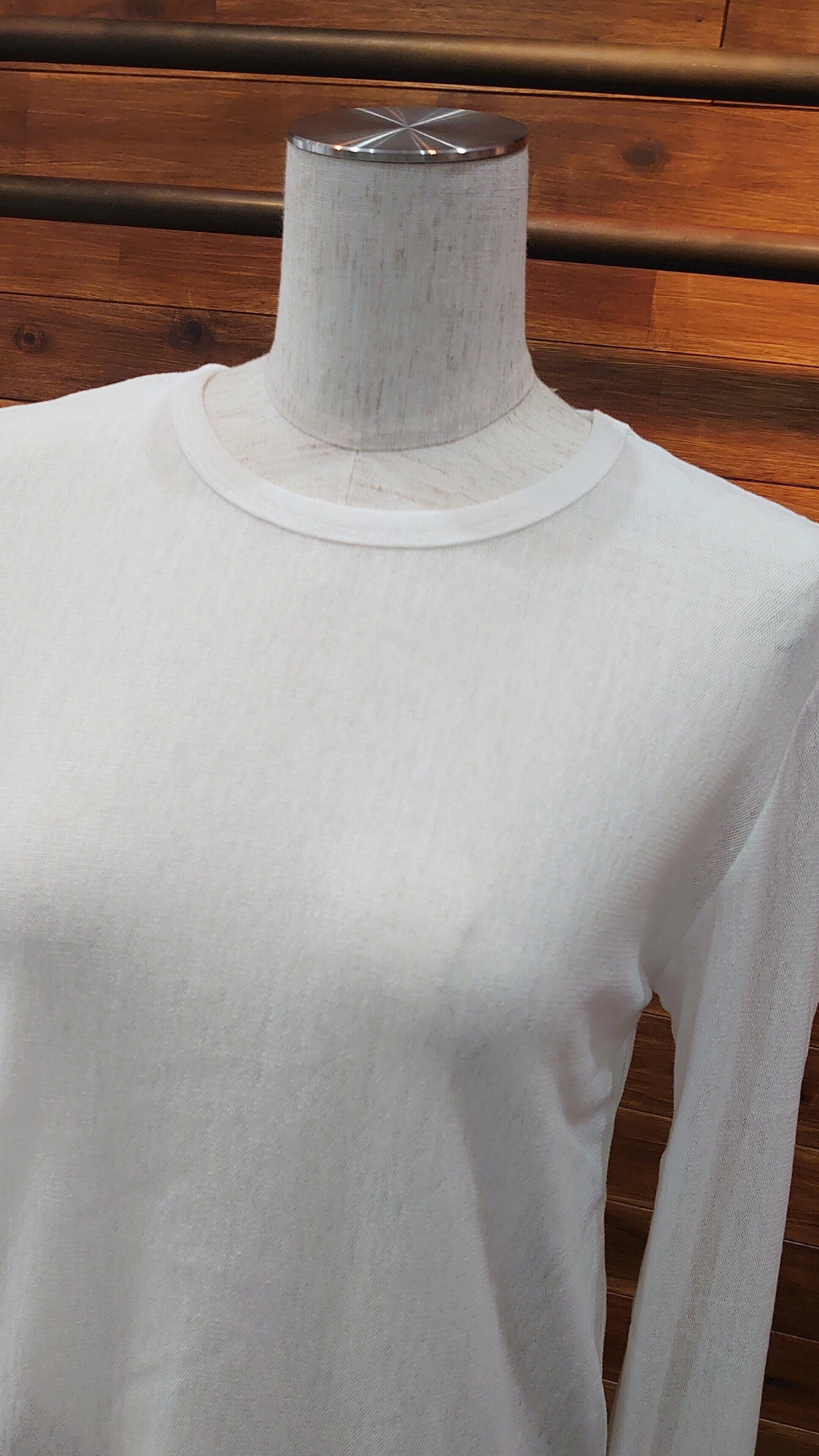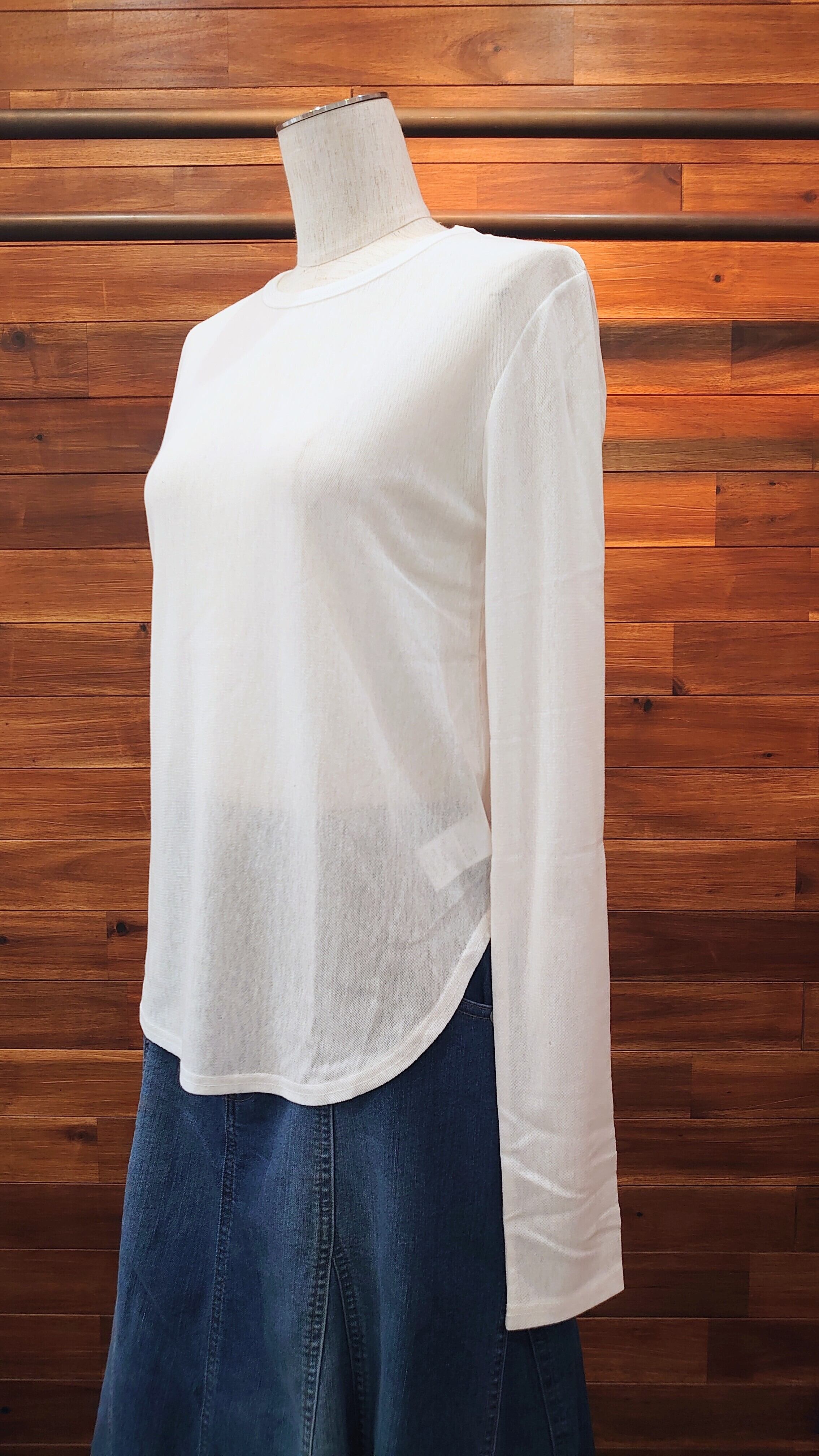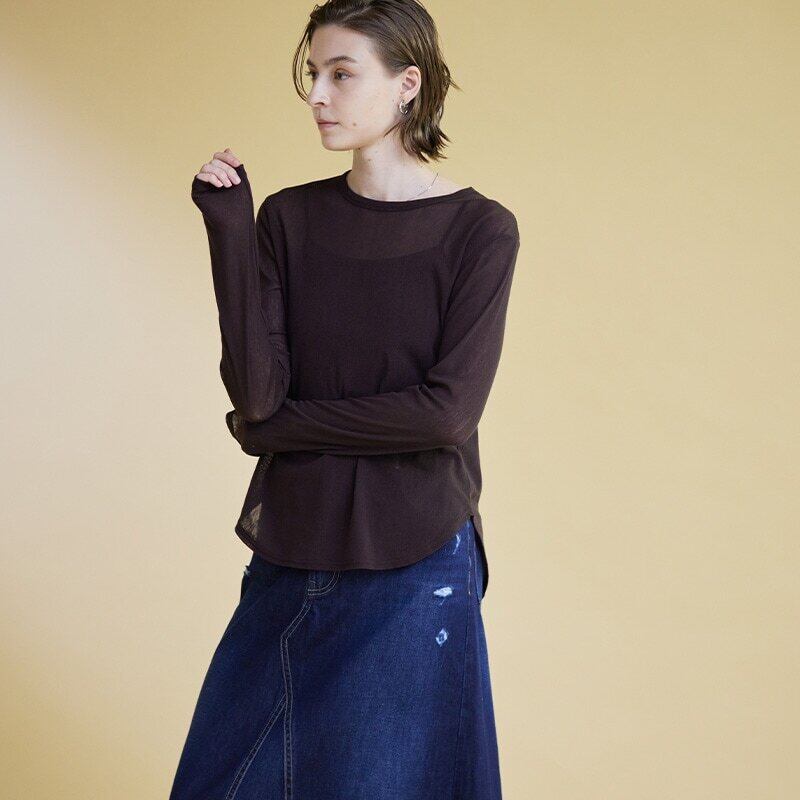 トレンド感のあるレイヤードスタイルにも活躍できるヘムカーブメッシュプルオーバー。